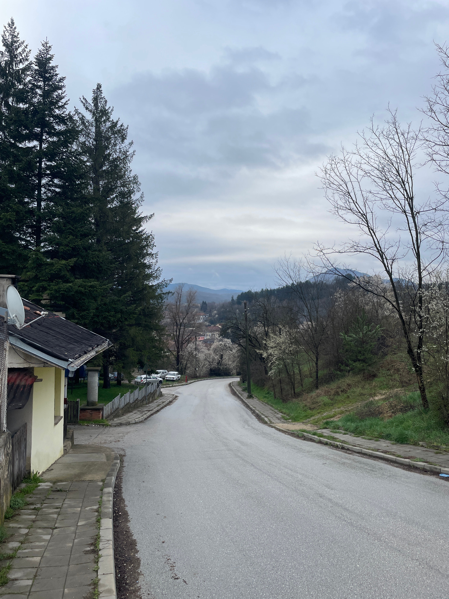 The image depicts a view from an elevated position looking down a paved road in the city of Elena, Bulgaria. The road curves gently downhill and is bordered by a curb and sidewalk on the right side. B…read more