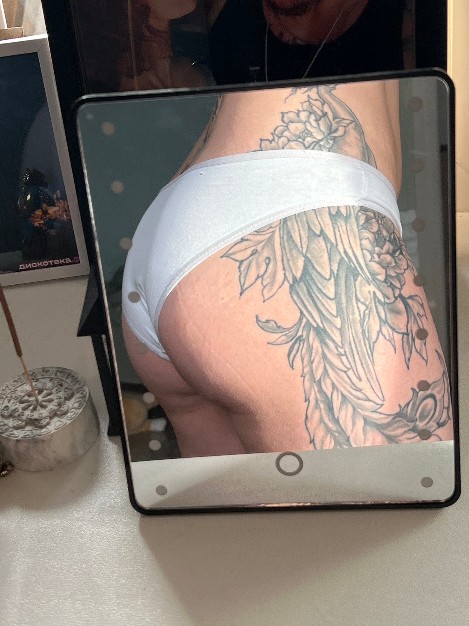 A lit vanity mirror shows a reflection of a woman's lower back and buttocks. She is wearing white underwear. A tattoo of flowers and leaves is visible on her skin. The mirror rests on a surface with o…read more