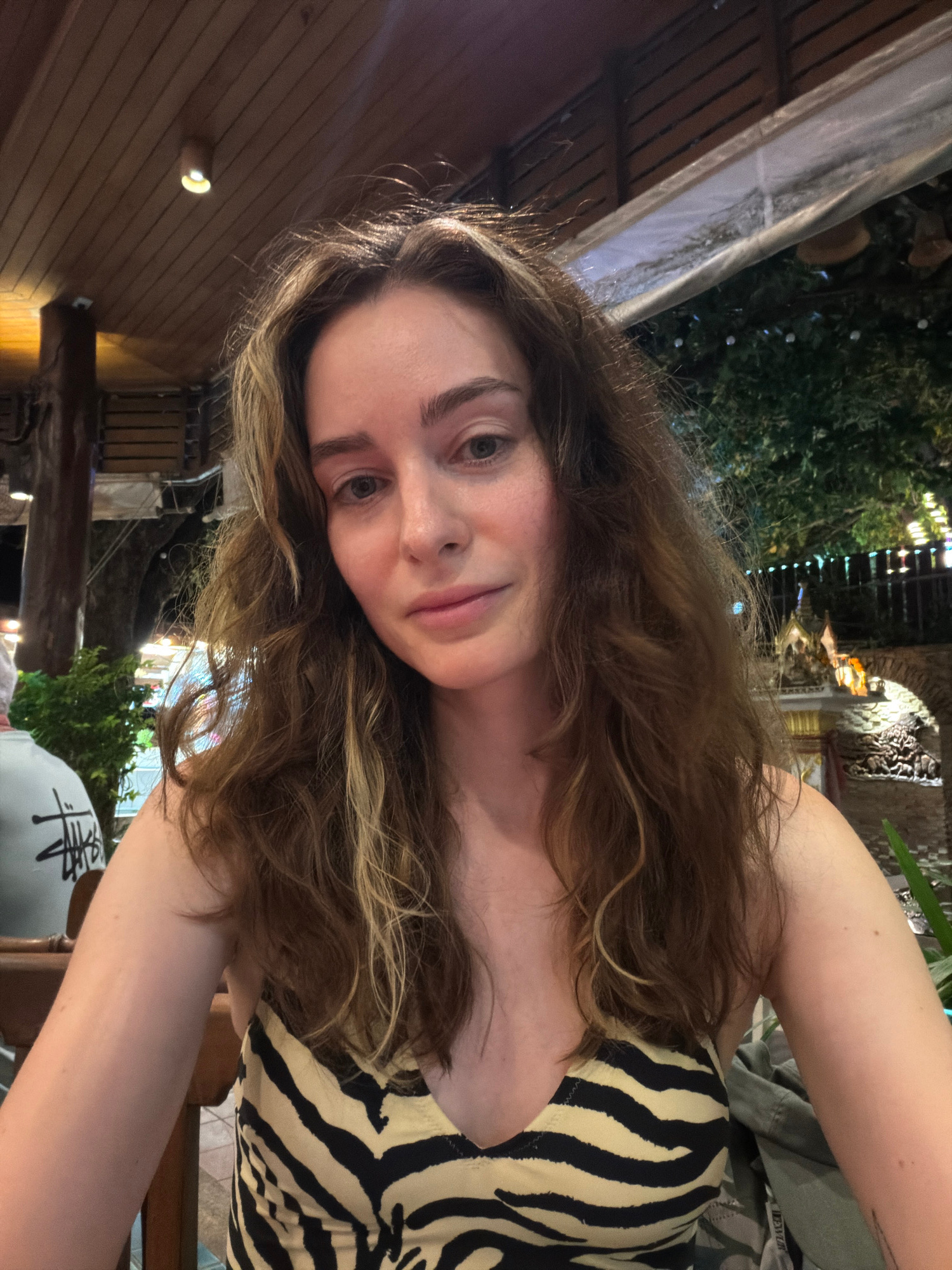 A fair-skinned female, approximately 20-35 years old, is depicted in a close-up selfie-style photograph, looking directly at the camera. She has long, wavy brown hair with blonde highlights and light-colored eyes. She wears a black and beige/yellow zebra-print top. The scene is set at night or dusk, within what appears to be an open-air or semi-covered restaurant or dining area in Patong, Thailand. The background features a slatted wooden ceiling with a warm-toned recessed light fixture visible above the subject's head. To the left, a portion of a male individual's back is visible, wearing a light-colored t-shirt with a black "Stüssy" logo. Dark tree trunks and green foliage are present throughout the background. To the right of the primary subject, a large green tree is illuminated by decorative string lights (blue, white, and yellow/orange). Beneath the tree and lights, a traditional Thai spirit house, adorned with small lights, stands on a stone base. Adjacent to it, a stone archway contains what appear to be multiple relief carvings or statues of elephants. A clear plastic canopy or roofing section is visible towards the top right of the frame. | Open Wire