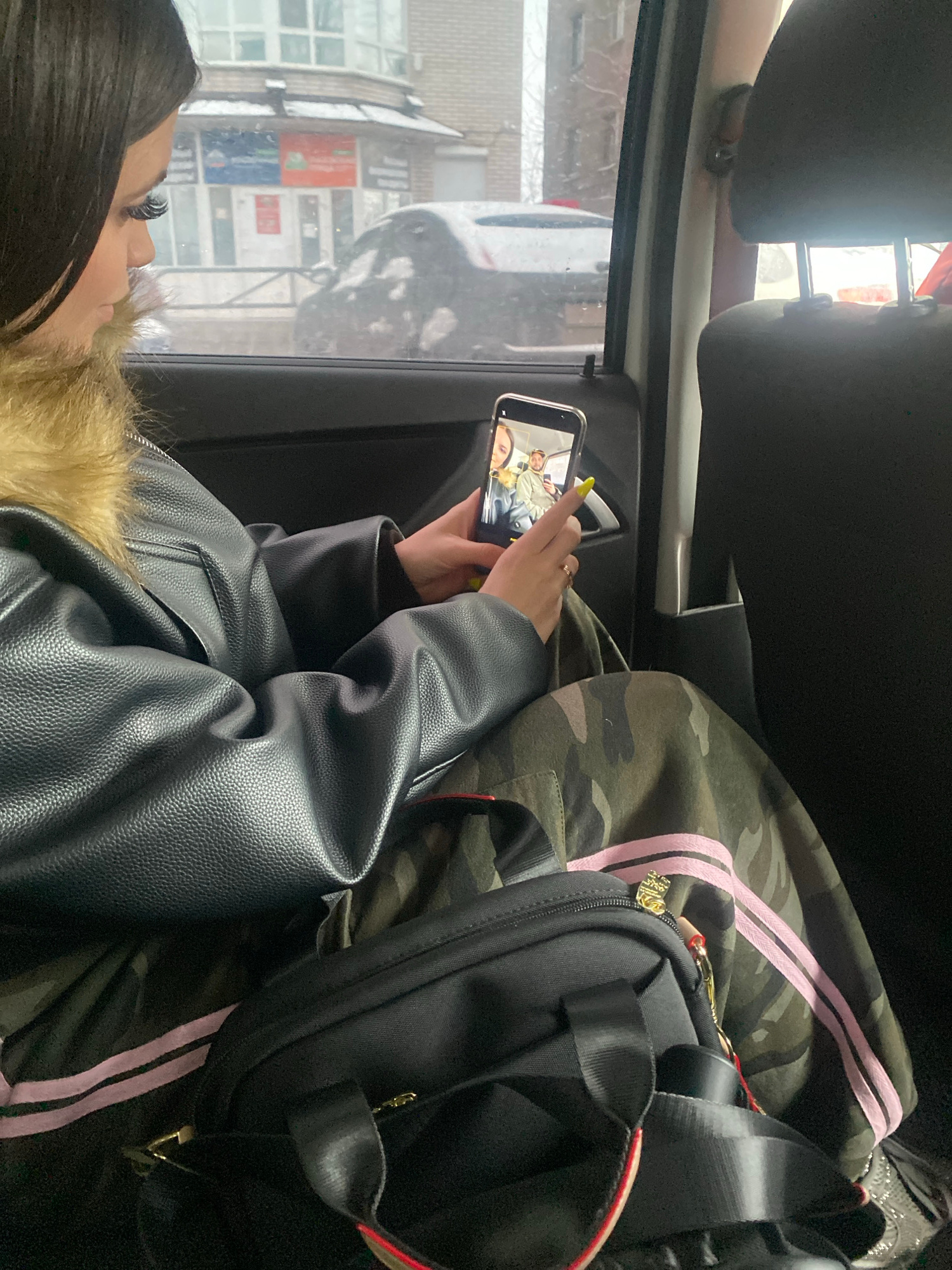 A woman sits in a car, viewing a phone screen. She wears a black leather jacket with fur trim, and has long black hair. On the screen of her phone, two people, presumably in the same car, are visible.…read more