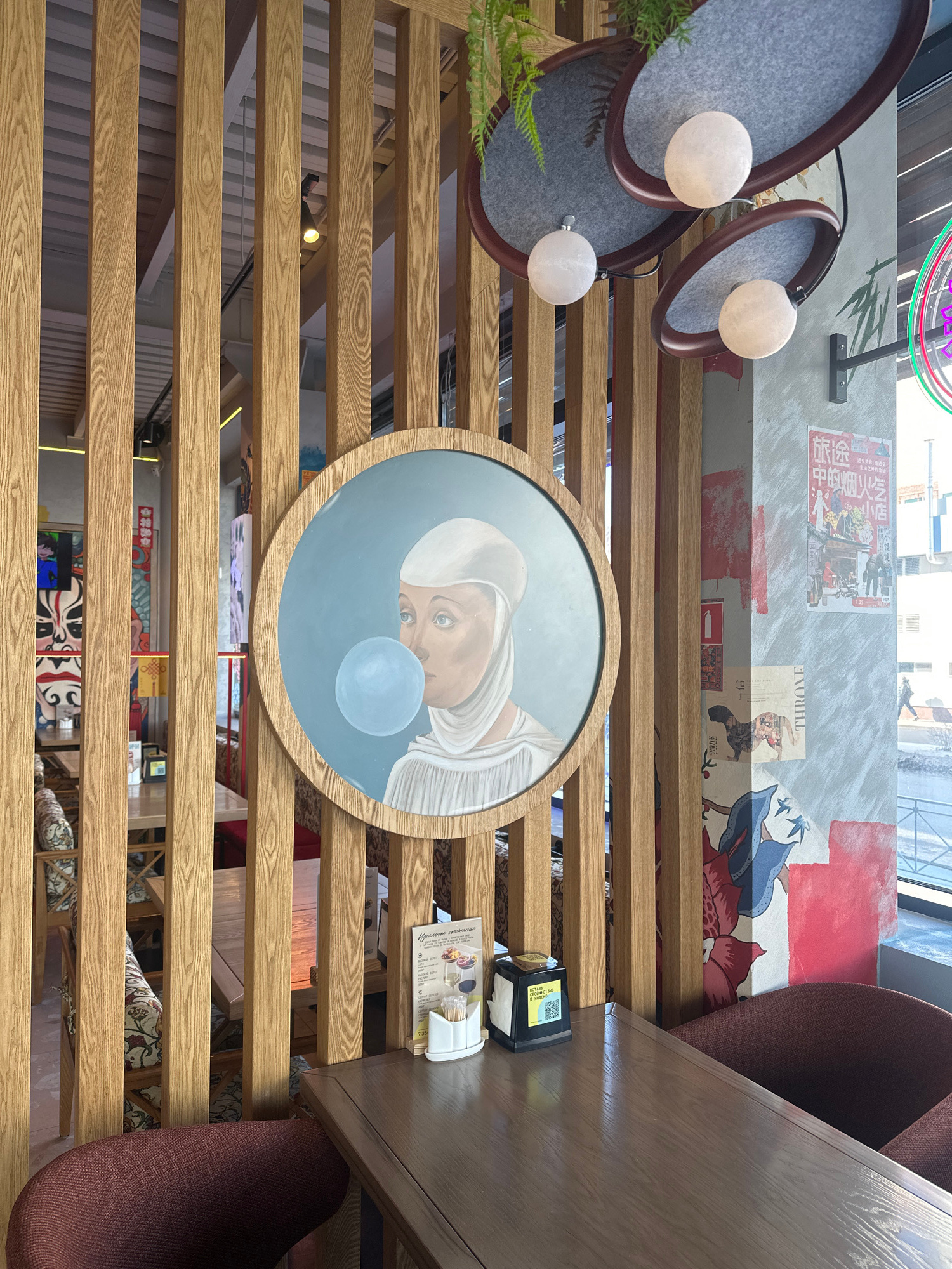 The image depicts the interior of a restaurant in Surgut, Russia, specifically the seating area as seen from above. The focal point is a wooden partition wall constructed of horizontal slats, through…read more
