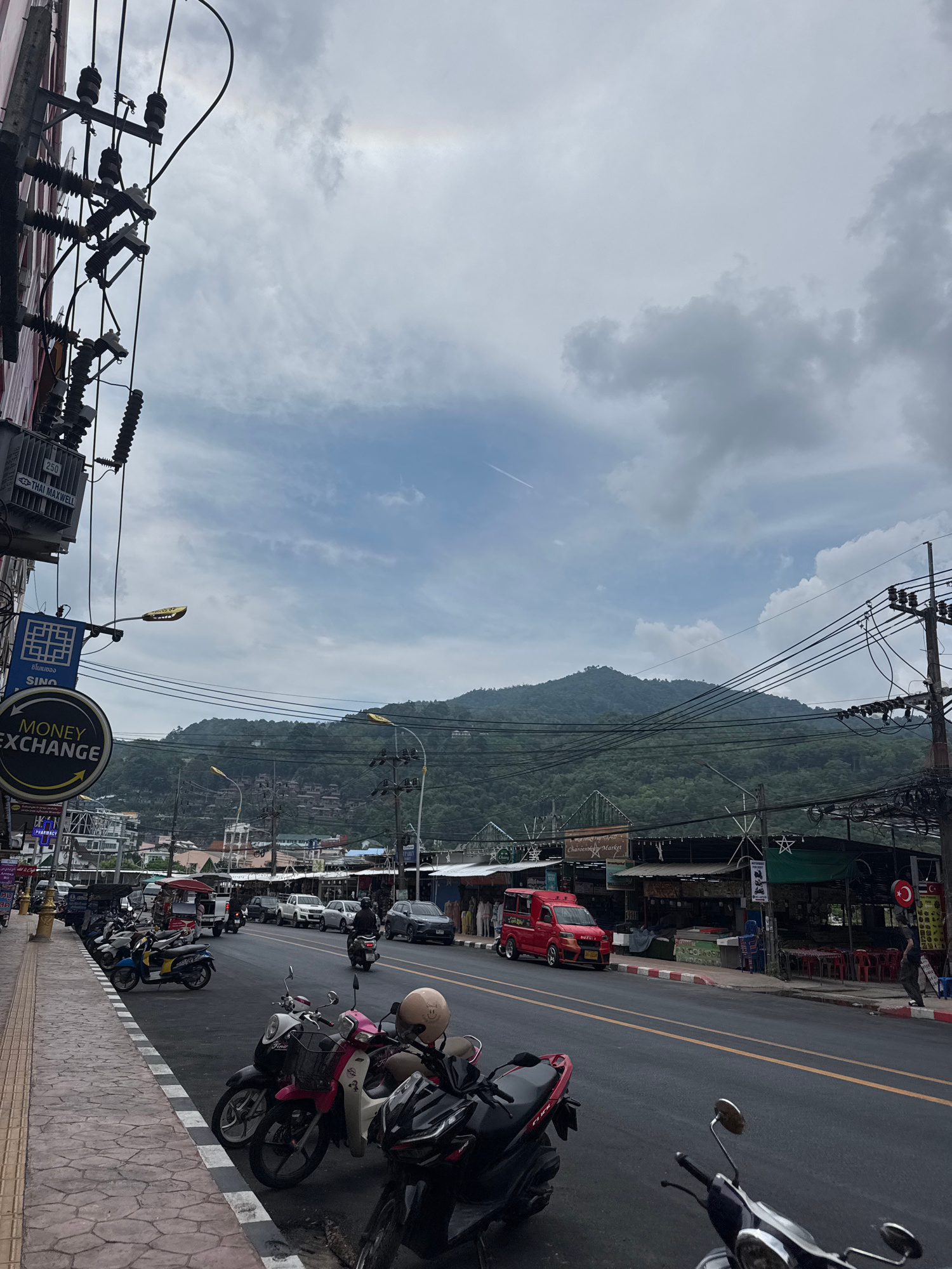 The image depicts a street scene in Patong, Thailand, under a cloudy sky. A mountain rises in the background. Utility poles and wires crisscross the view. A street lined with parked motorbikes runs al…read more