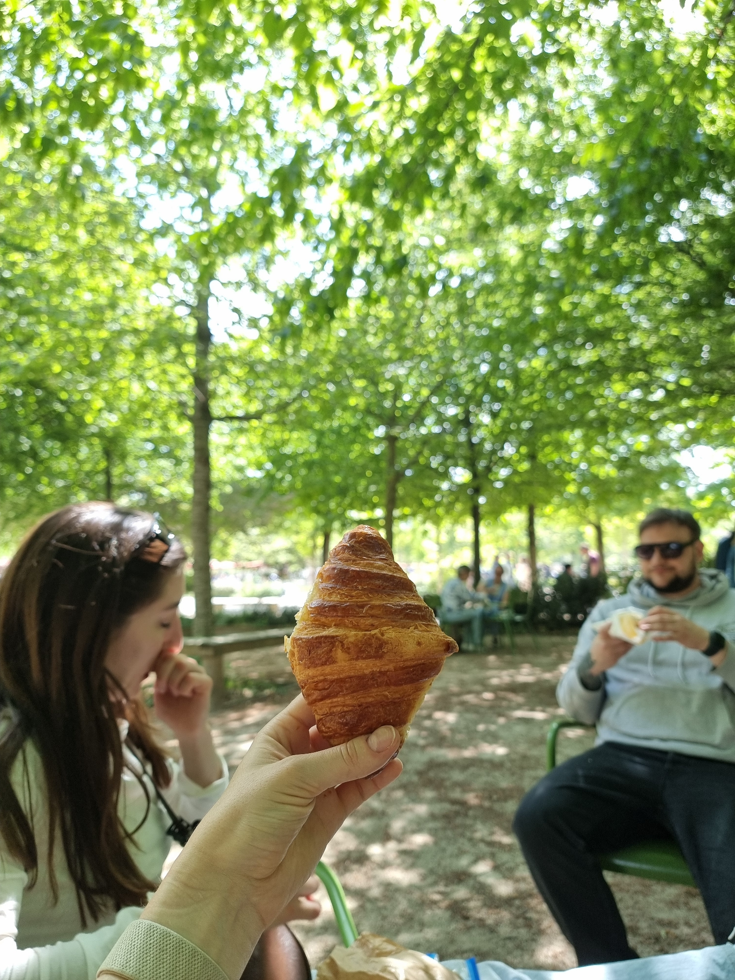 The image captures an outdoor scene in what appears to be a park or garden, likely in Paris, France, given the presence of a croissant. The photo is taken at a tilted angle. A woman is in the foregrou…read more