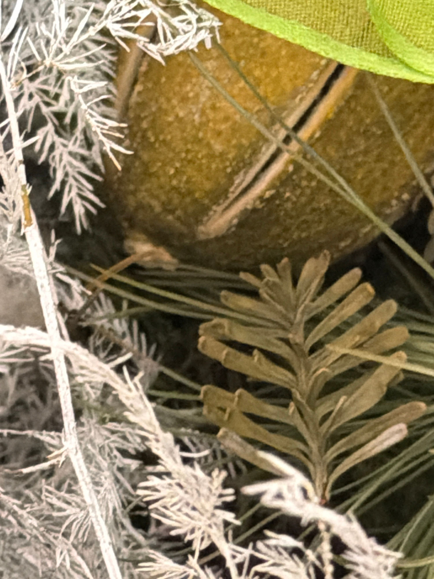 The image depicts a close-up view of a decorative arrangement. A yellow sphere-shaped object with a textured surface is partially visible, situated to the left. A piece of green fabric is also visibleβ¦read more