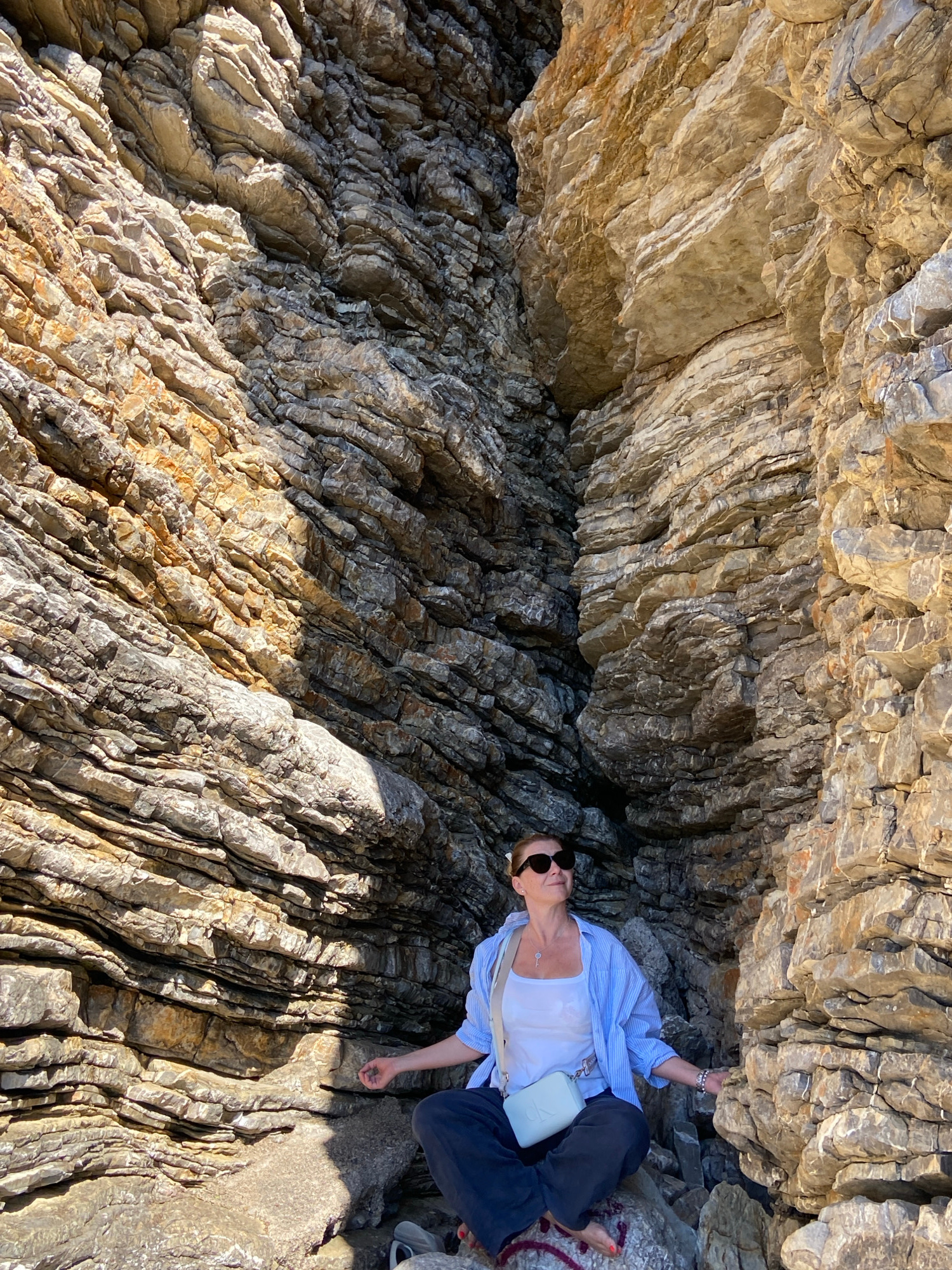 A woman is captured reclining or resting within a striking, layered rock formation, indicative of a cliff face or an alcove along a coastline in Budva, Montenegro. The image is brightly lit by natural…read more