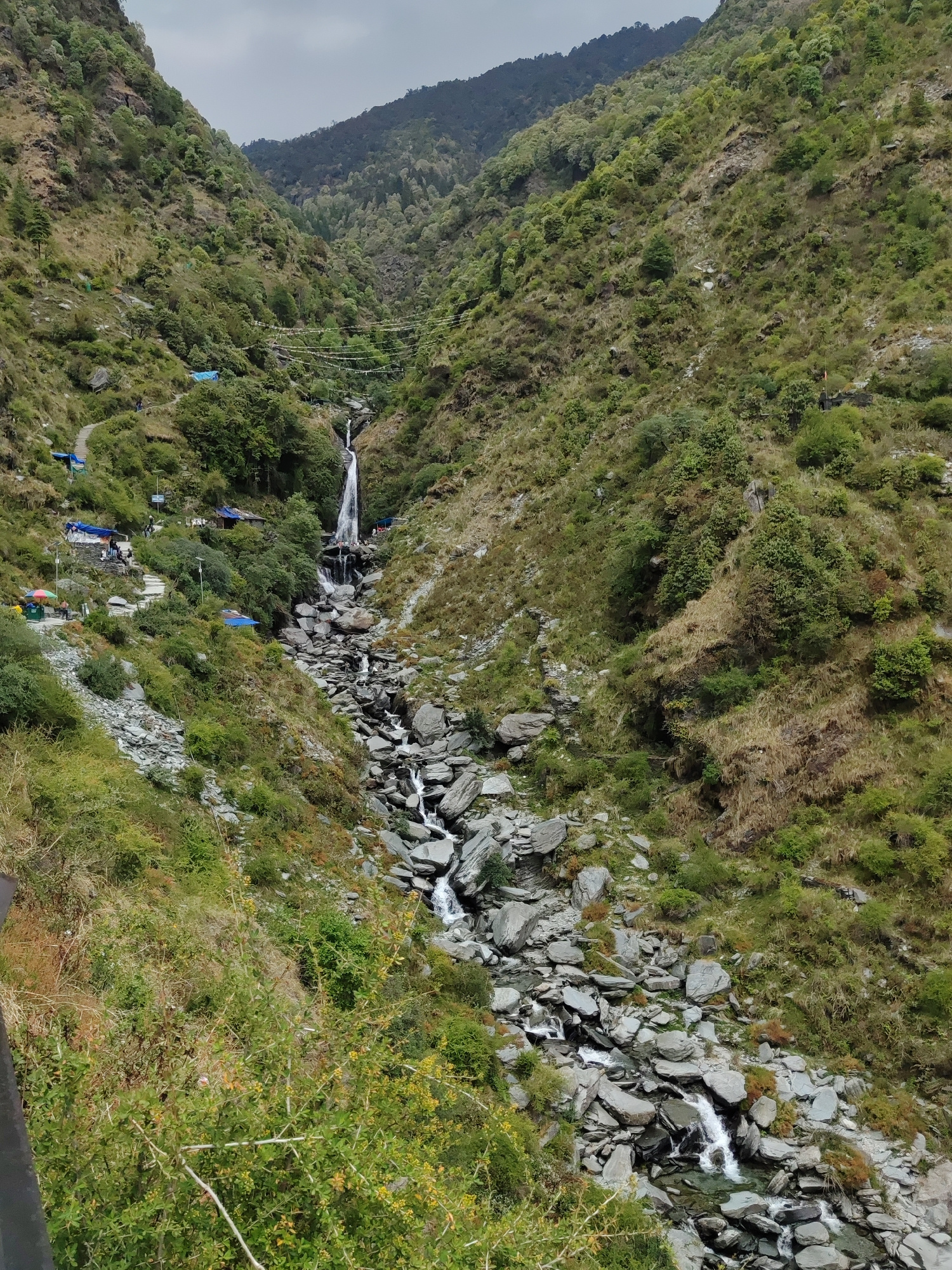 The image captures a scenic view of a deep mountain valley in Bhagsu, India, featuring a prominent waterfall and a rocky stream. Lush green and brownish vegetation densely covers the steep slopes on b…read more