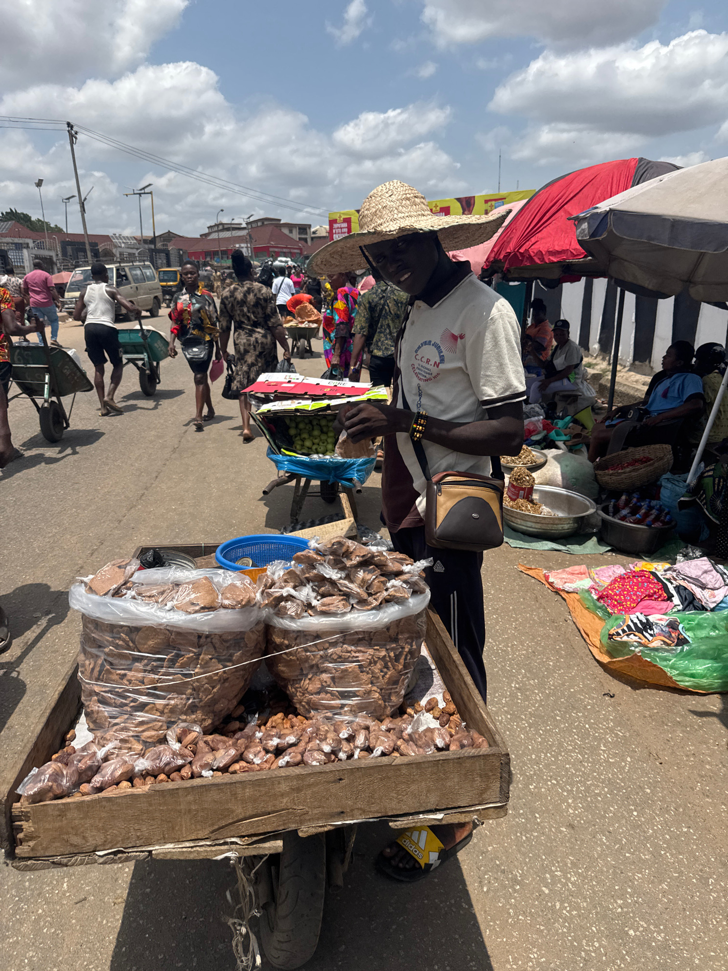 This media file depicts a vibrant and bustling street market scene in Onitsha, Nigeria, under bright daylight with a clear sky dotted with white clouds. The central figure is a male vendor, appearing…read more