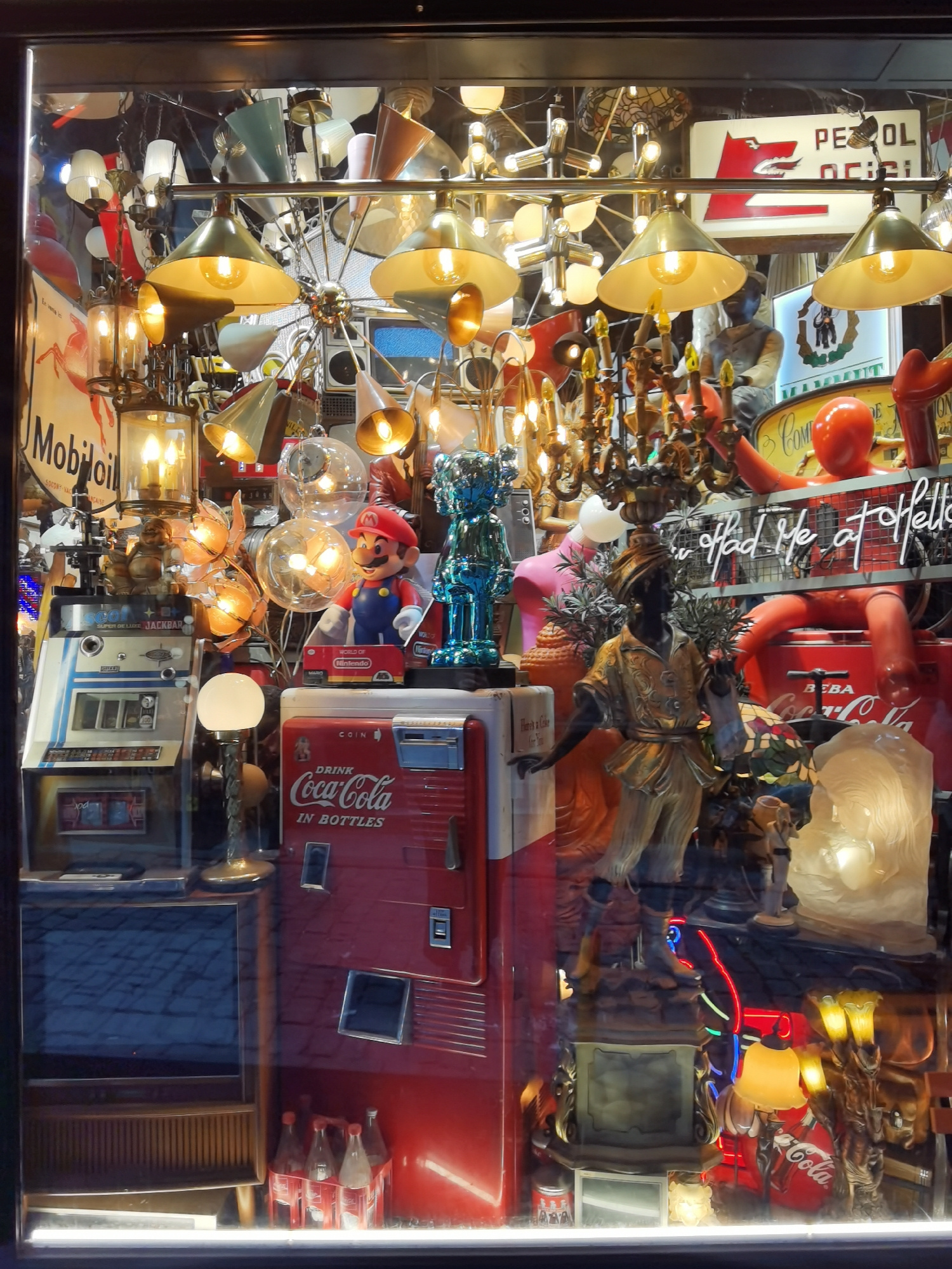 This media file captures a vibrant and densely packed shop window display, likely from an antique, retro, or collectibles store in Beyoğlu, Turkey. The scene showcases an eclectic assortment of vintag…read more