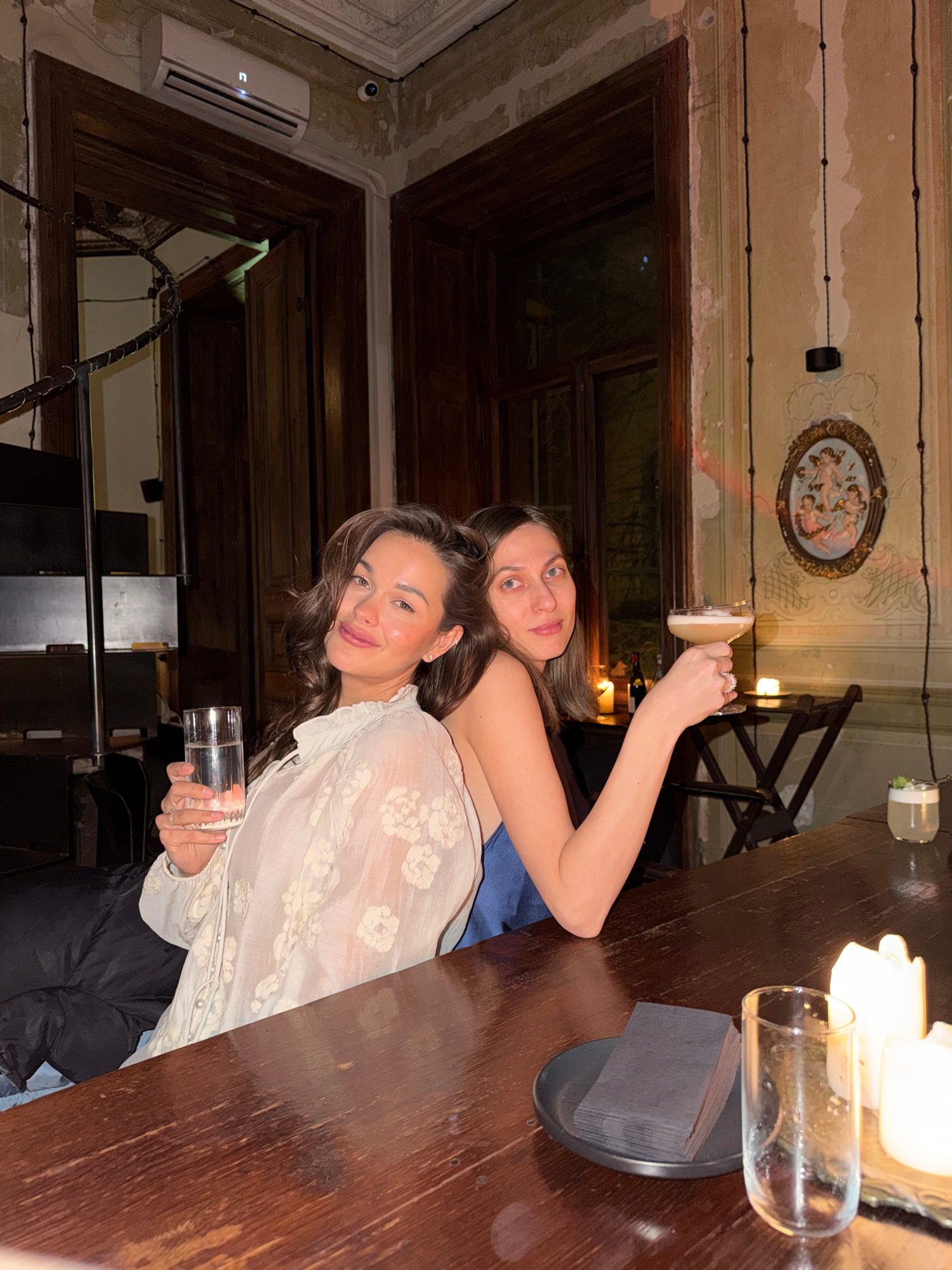 Two women are seated back-to-back at a dark wooden bar or table within a dimly lit establishment in Tbilisi, Georgia. The woman on the left, with dark wavy hair, wears a light-colored, sheer blouse wi…read more