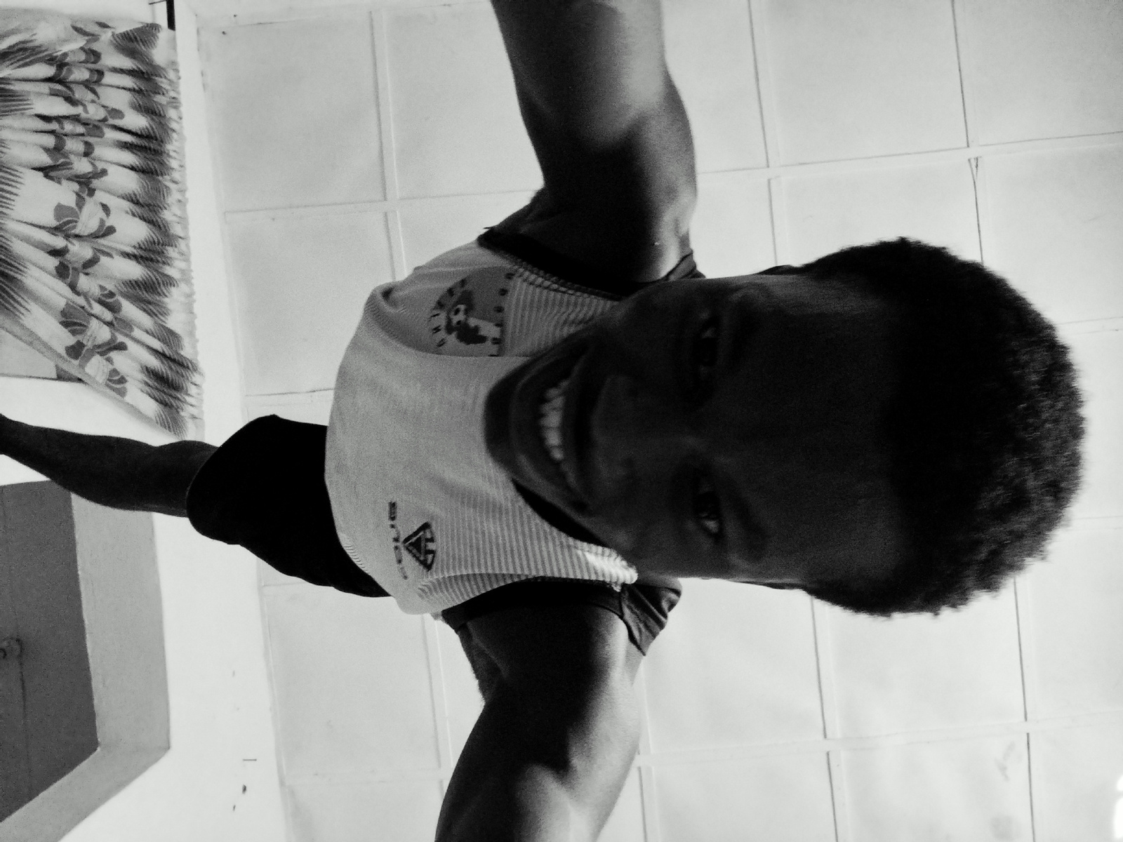 A black and white, close-up, high-angle shot depicts a dark-skinned person with short hair, smiling broadly. The person is wearing a light-colored tank top with a dark trim and dark shorts. The backgr…read more