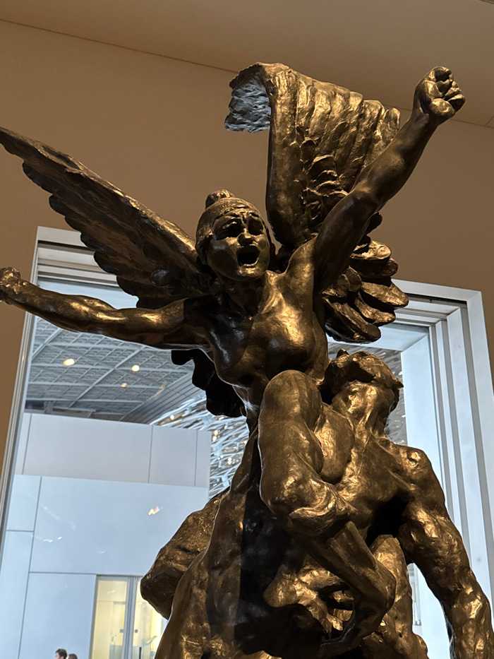 A large, dark bronze sculpture depicting two dynamic figures is prominently displayed indoors at the Louvre Abu Dhabi on Saadiyat Island, Abu Dhabi, United Arab Emirates. The upper figure, an anguishe…read more