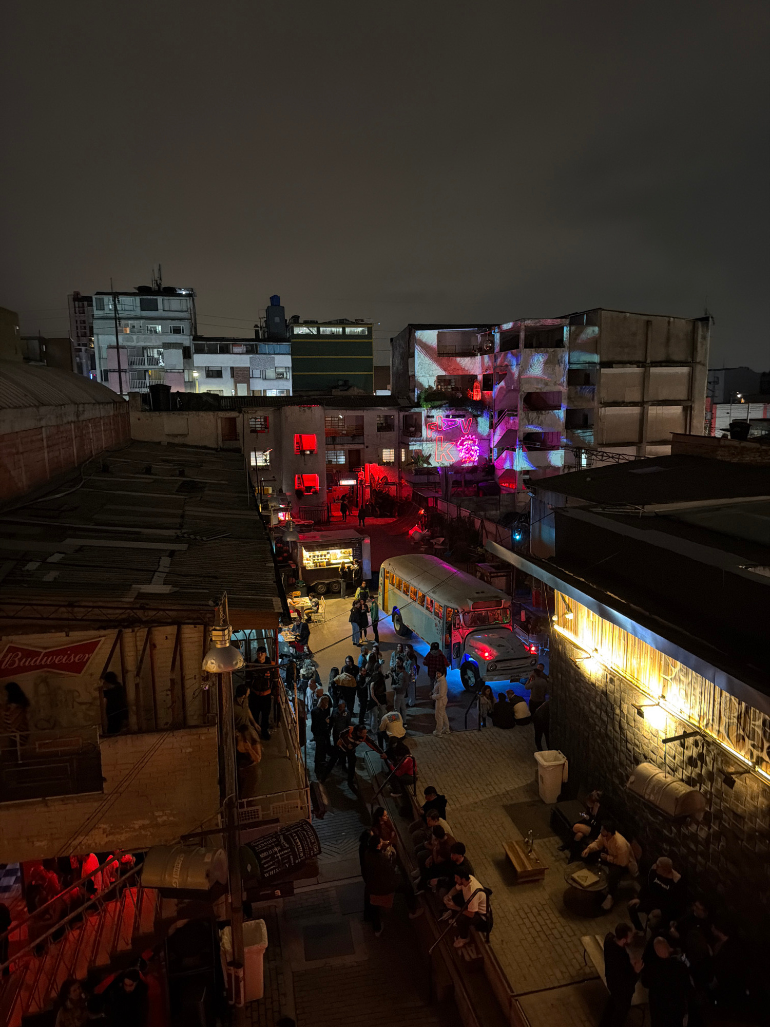 This nighttime image captures a lively urban entertainment district in Bogota, Colombia, likely located within the Chapinero neighborhood. The scene is observed from an elevated perspective, looking d…read more