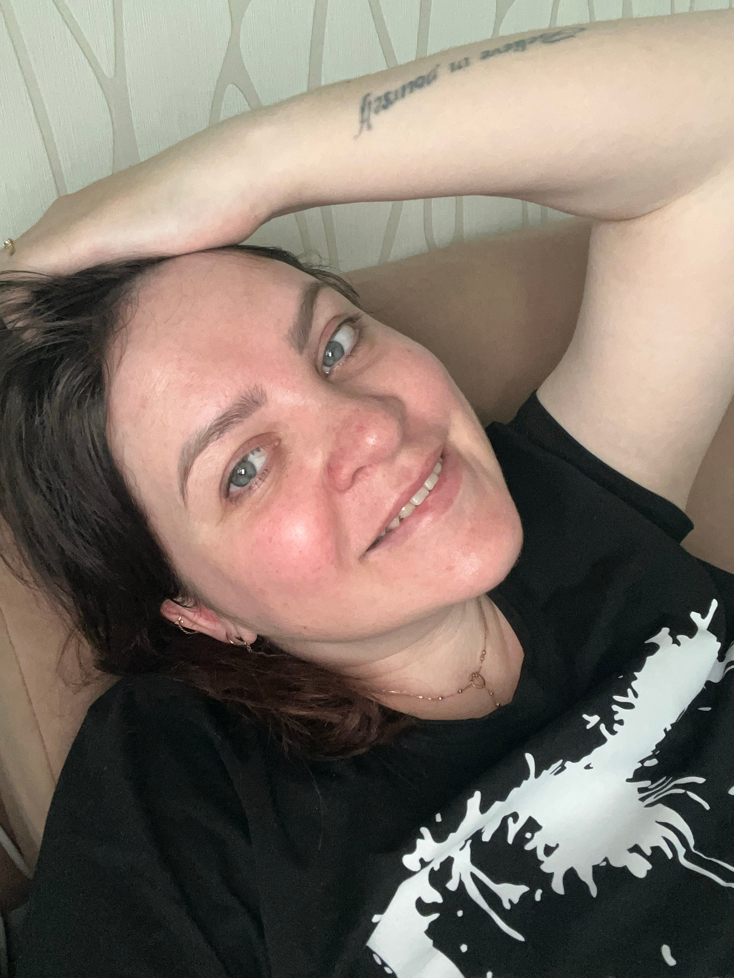 A close-up portrait features a woman lying down and looking directly at the camera with a soft, friendly smile. She has dark hair, striking blue-grey eyes, and fair skin with a slight redness visible…read more