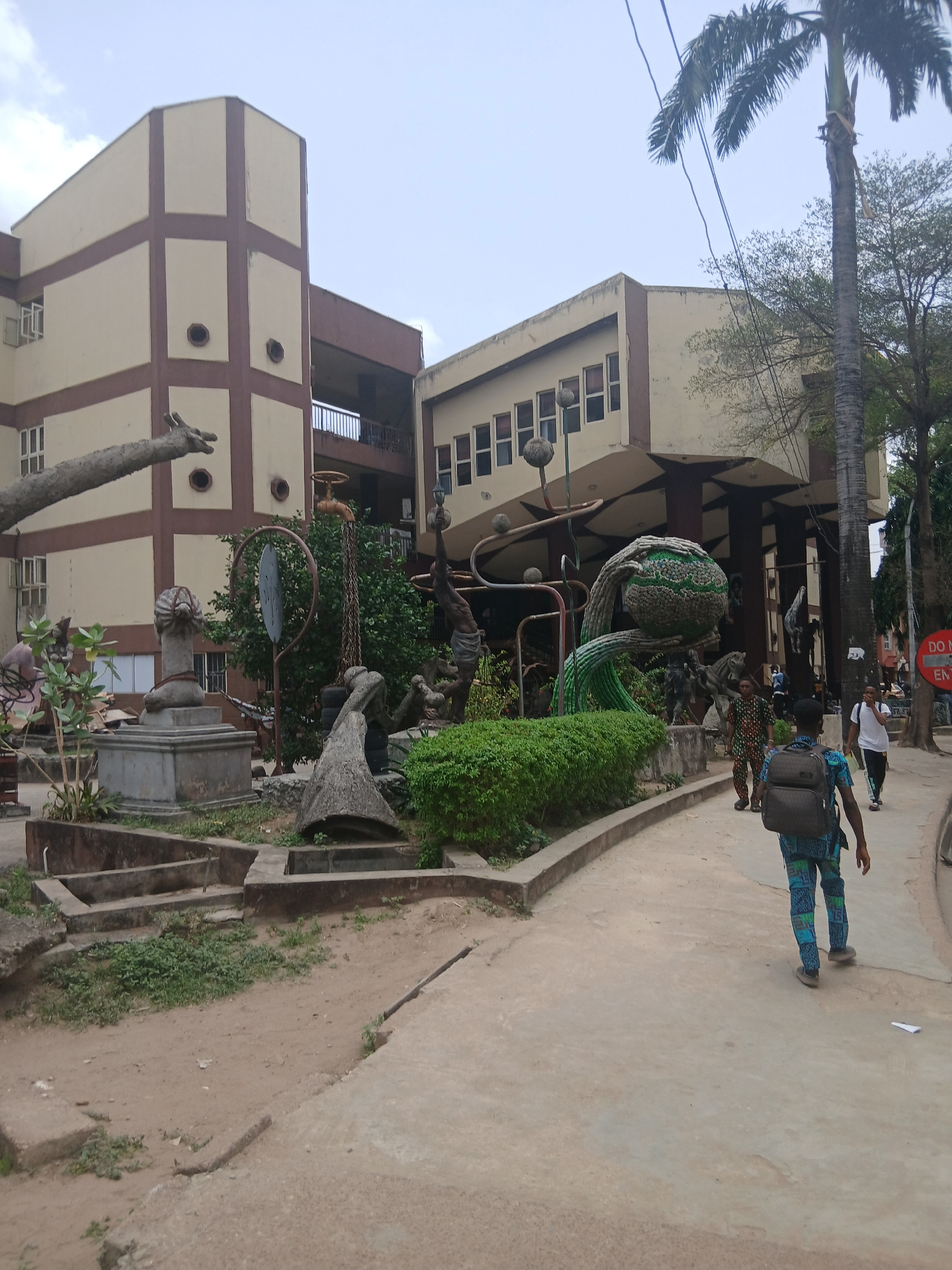 The image shows a daytime scene in Lagos, Nigeria. A multi-story building with a tan facade and brown grid pattern is visible on the left. In front of the building is a public space with sculptures an…read more