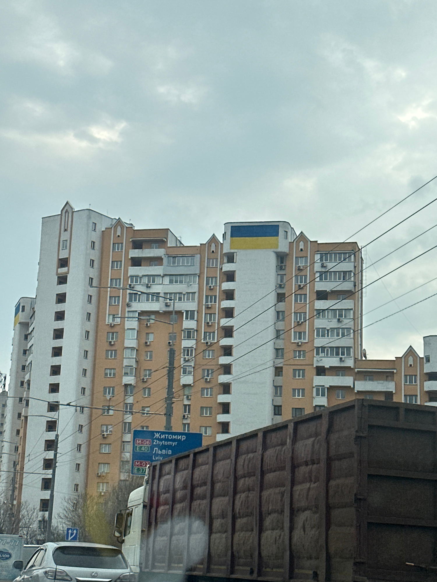 The image shows a tall apartment building in Kyiv, Ukraine, partially obscured by a vehicle on the right. The building is predominantly white with light brown accents. A blue and yellow Ukrainian flag…read more