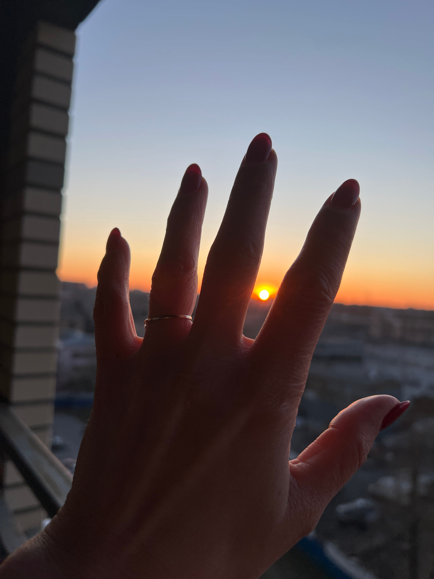 A right hand, adorned with a simple silver ring on the ring finger and red nail polish on all fingernails, is positioned in front of a sunset in what is suspected to be Saint Petersburg, Russia, judgiβ¦read more