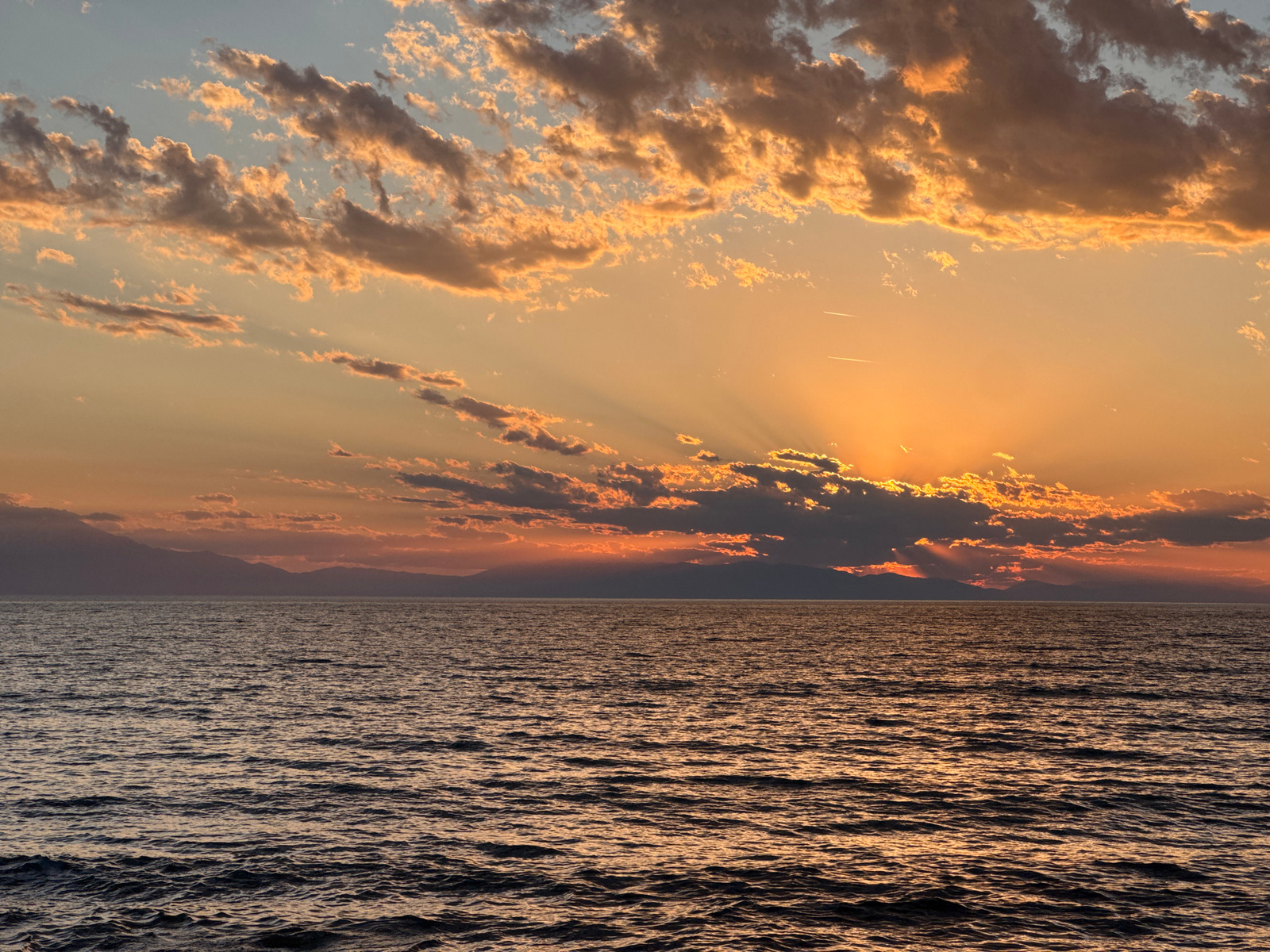 The image depicts a sunset over the sea in Nea Potidea, Greece. The sun is partially obscured by clouds, creating rays of light that pierce through to the horizon. Distant mountains are visible. The s…read more