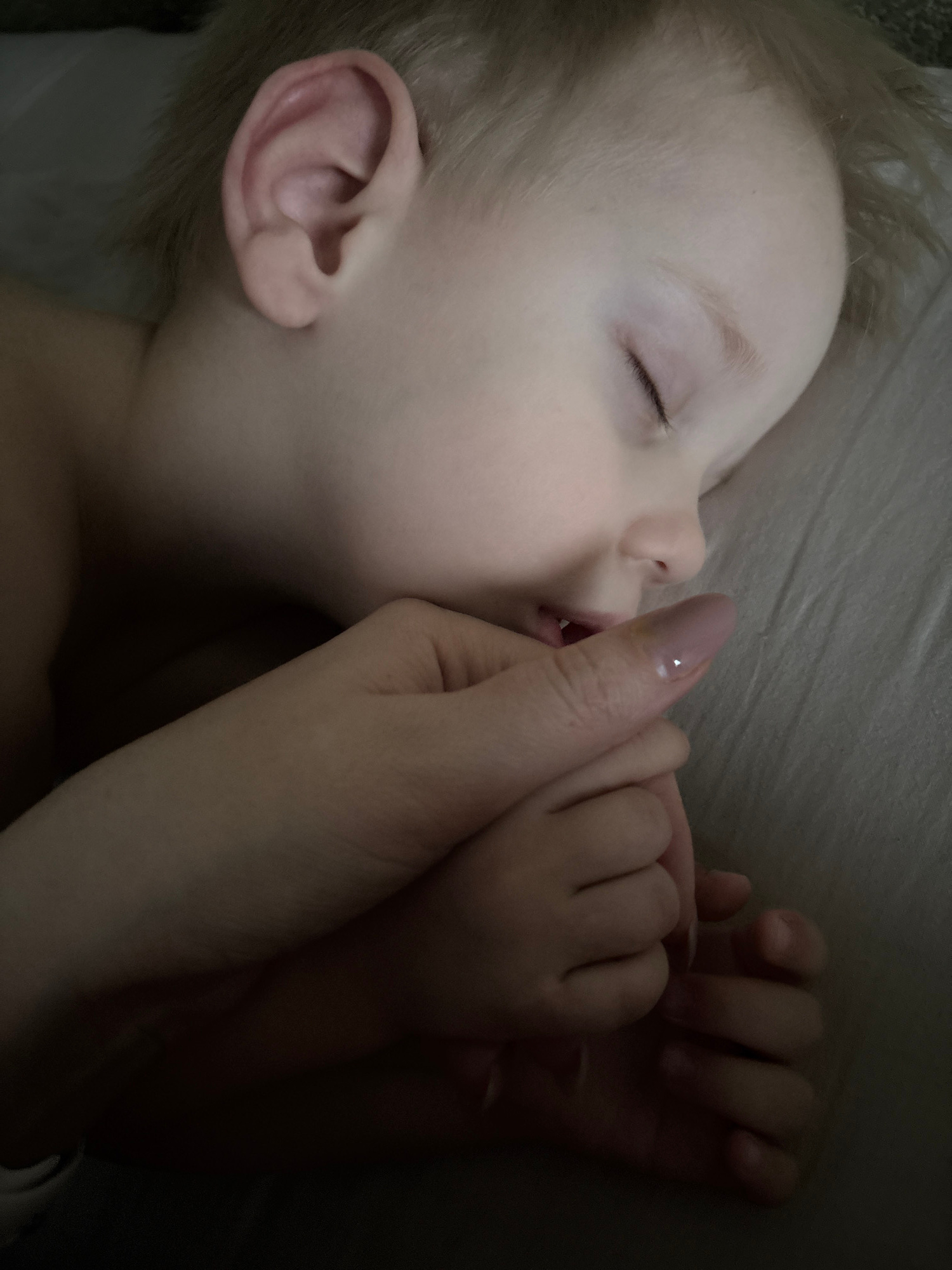 A fair-skinned, blond toddler is sleeping in a dimly lit environment. The child's eyes are closed, and a partially visible adult hand is holding the child's hand, with one finger near the toddler's mo…read more