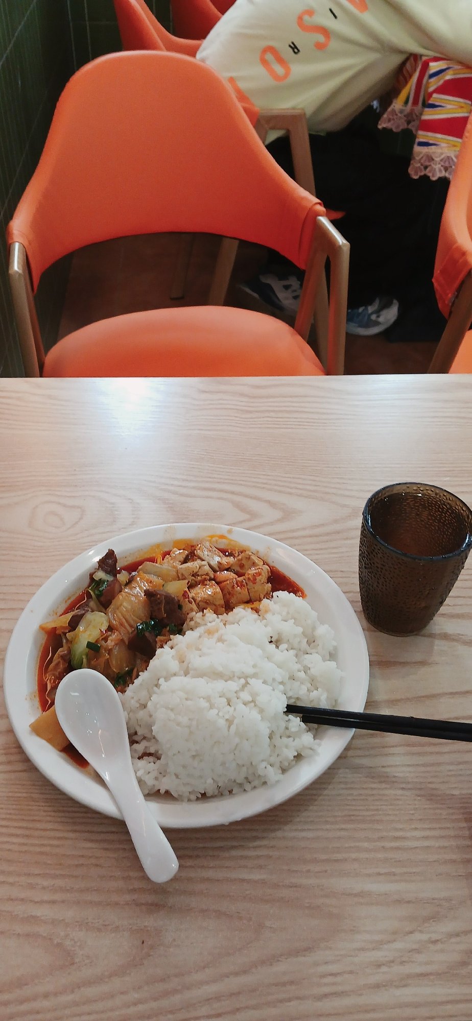 The image shows a wooden table in what appears to be a dining area. On the table is a white plate containing a serving of rice, tofu, and stir-fried vegetables in a red sauce. A white spoon and black…read more
