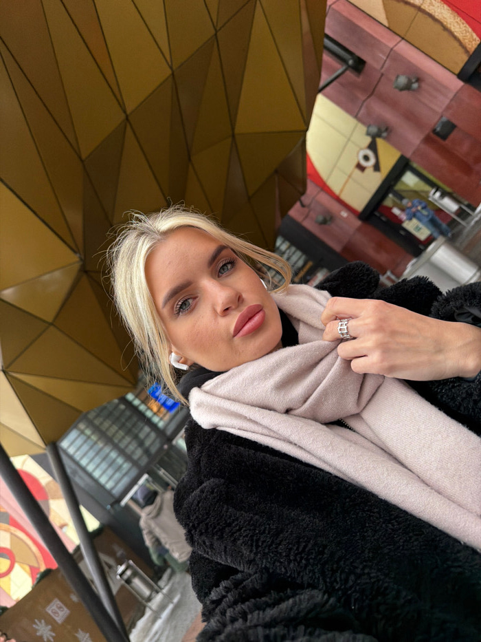 A blonde-haired female individual with blue eyes and light makeup is captured in a close-up, upward-angled self-portrait. She wears a black textured jacket, a light beige scarf, and a white wireless e…read more