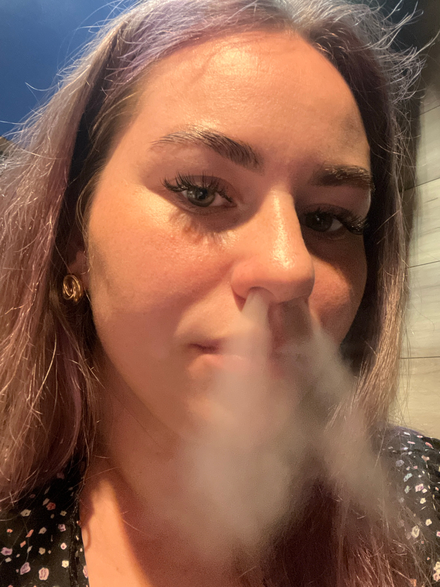 A close-up, angled portrait shows a woman exhaling a thick cloud of white smoke. Her face is fair, with pronounced eyelashes and slightly arched eyebrows. She has a gold earring visible on her left ea…read more