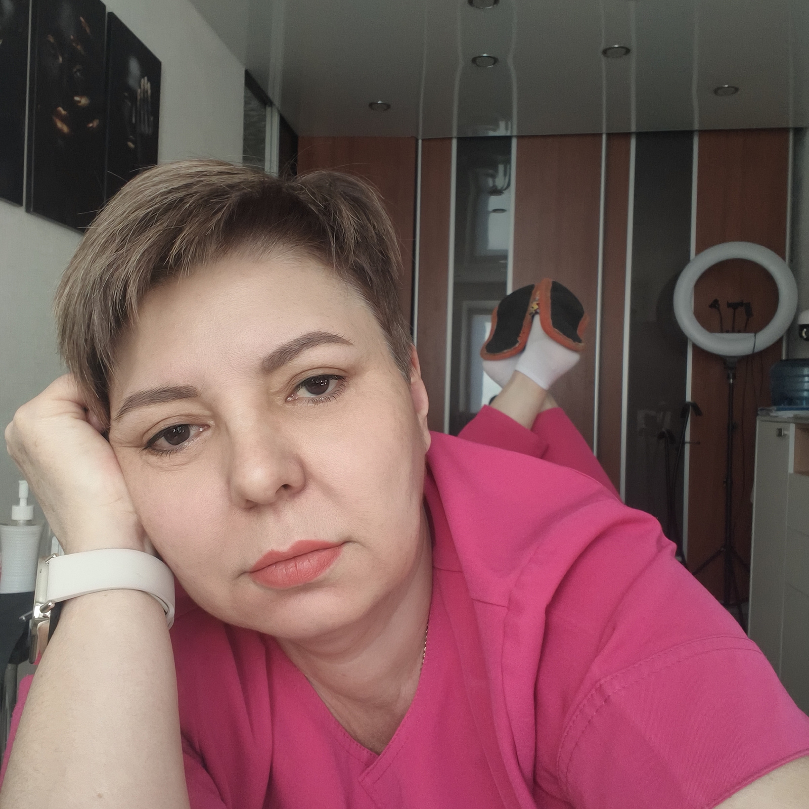 A person with short, light brown hair, wearing a bright pink top and a white smartwatch, is depicted lying prone with her head propped by her left hand. Her gaze is directed at the camera. Her feet, d…read more