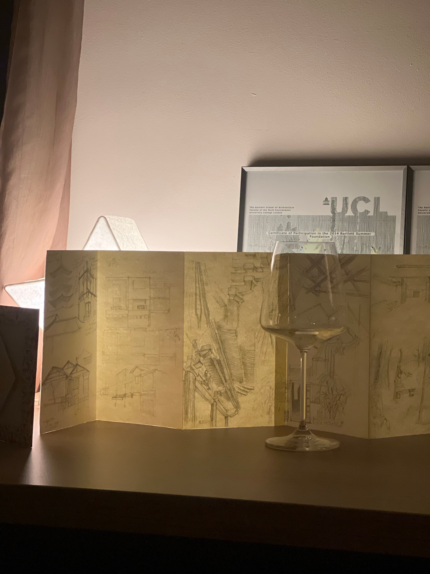 The image shows a framed certificate from UCL (University College London) on a wall, beside an accordion-folded sheet with architectural sketches and a wine glass. The lamp is also in view. There's in…read more