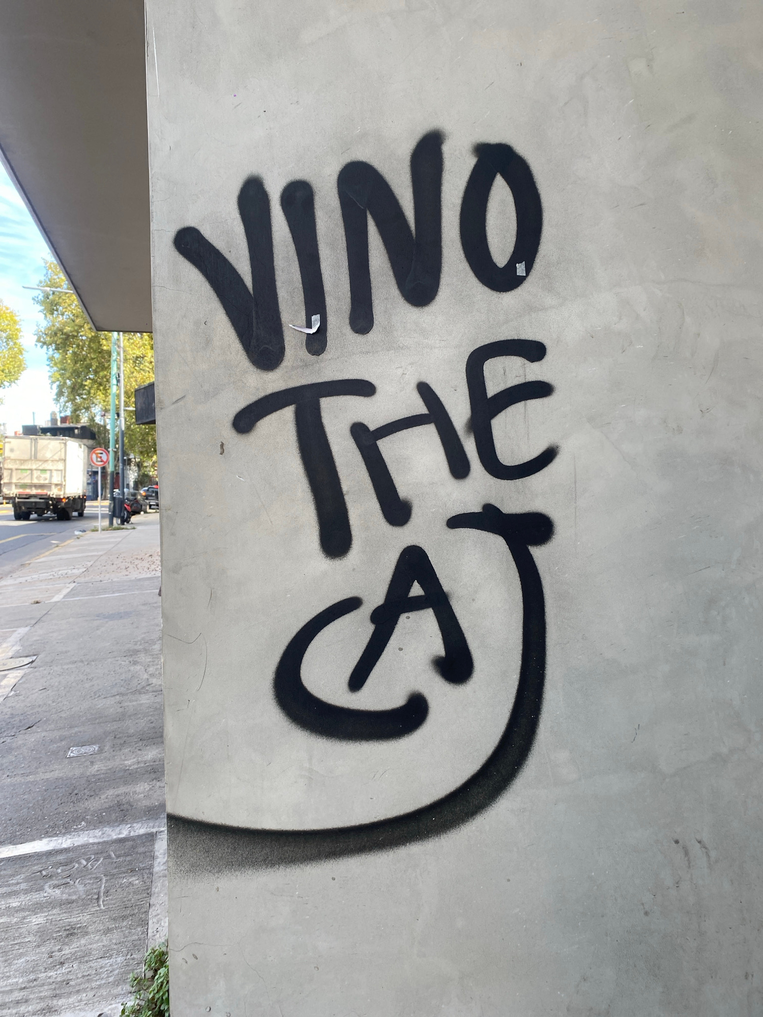 Graffiti, sprayed in black paint, reads "Vino the Cat" on a concrete surface. The graffiti is positioned vertically in the frame. The bottom of the frame shows a street scene. In the background, there…read more