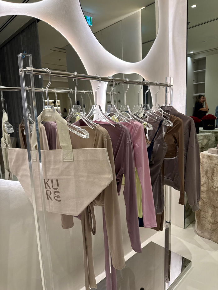 A rack of clothing hangs with clear hangers in front of a mirrored wall. Tops in pastel colors, tans, and grays are visible. A tan tote bag with the letters "KURS" printed on it hangs near the bottom.…read more