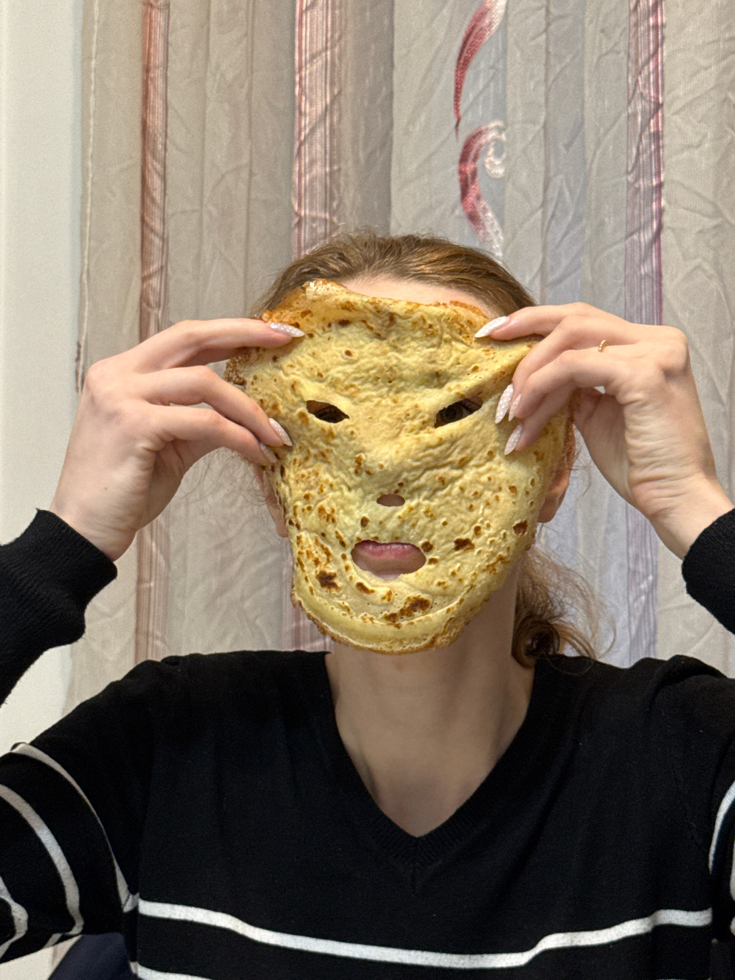 A woman is holding a large pancake or crepe with several holes cut in it up to her face, using it as a mask. Her hands are visible, with long fingernails, one wearing a gold ring. She is wearing a bla…read more