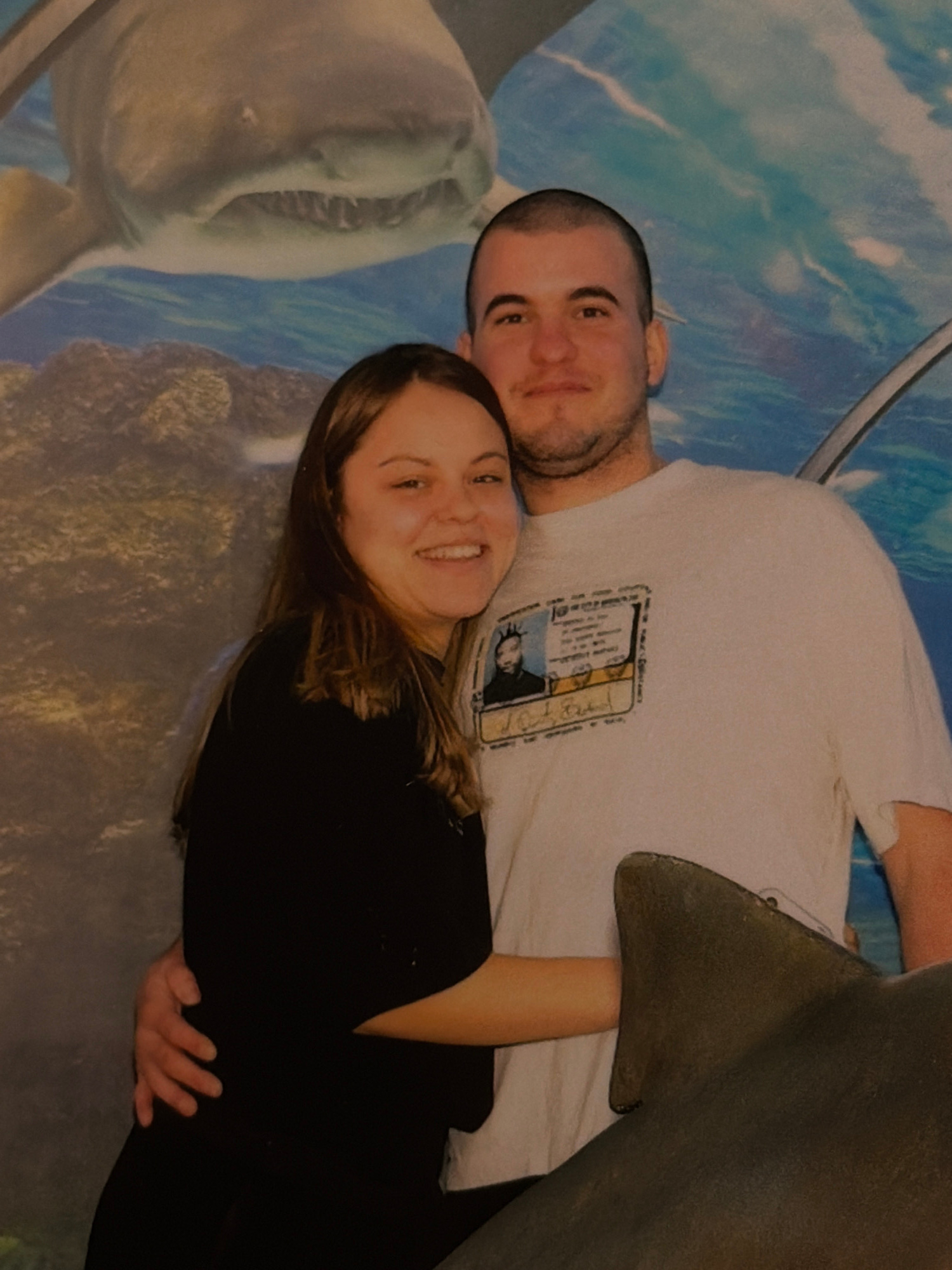A photograph depicts a man and a woman in an embrace, likely at an aquarium. The man has a shaved head, light skin, and a short beard, and he is wearing a white t-shirt. The woman has long brown hair…read more