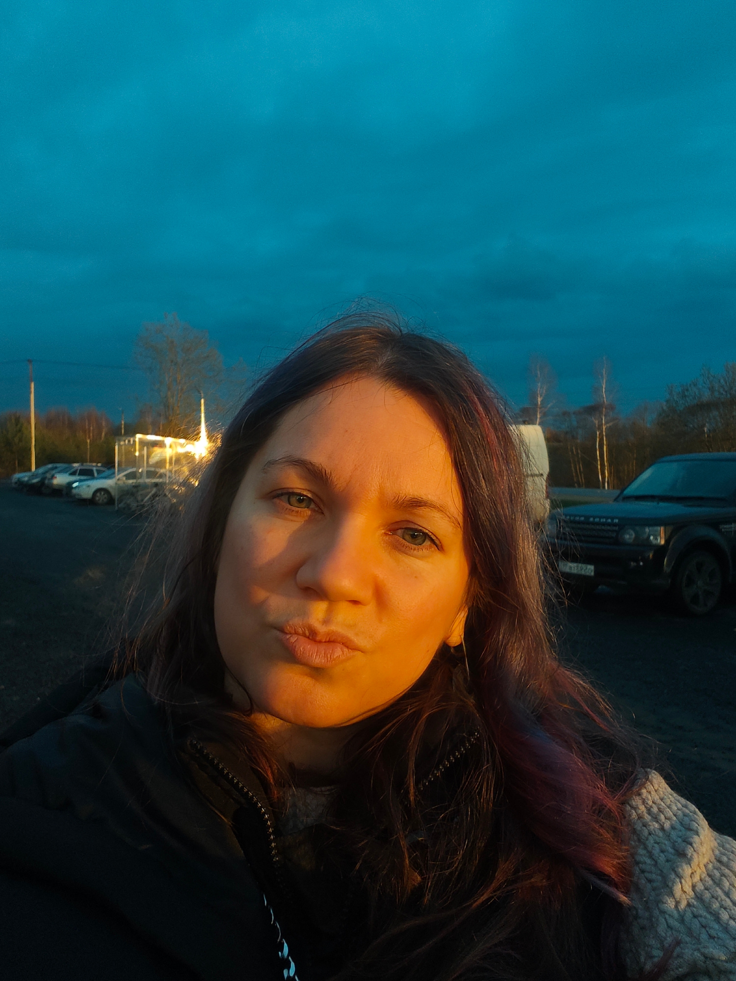 A woman is captured in a selfie outdoors, featuring her face prominently in the foreground, illuminated by warm, golden light. She has long, dark hair with subtle reddish-purple highlights and is maki…read more