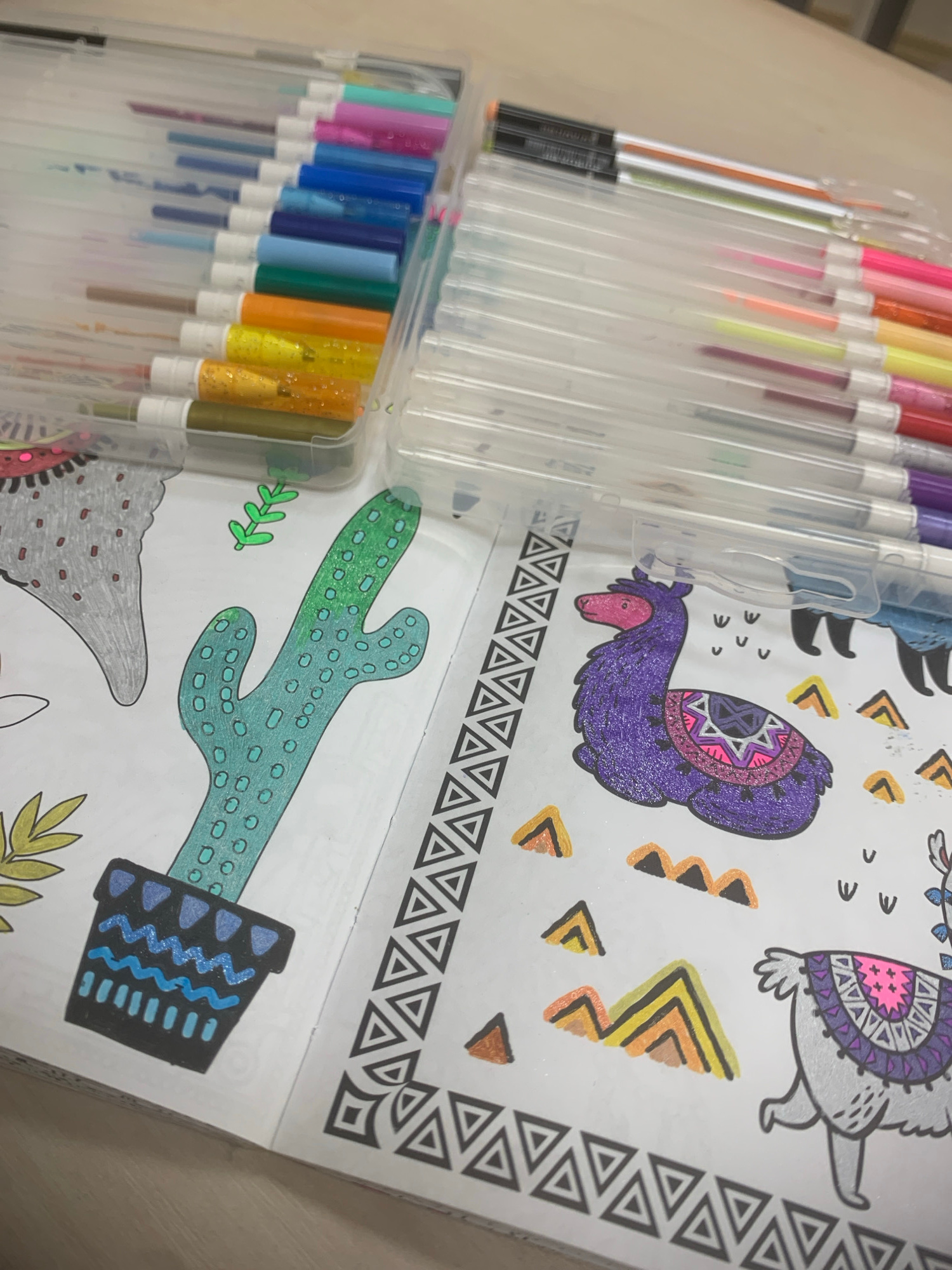 The image shows a coloring book with a set of colored pens. The coloring book features illustrations of llamas, a cactus in a pot, and decorative patterns. The illustrations are partially colored. The…read more