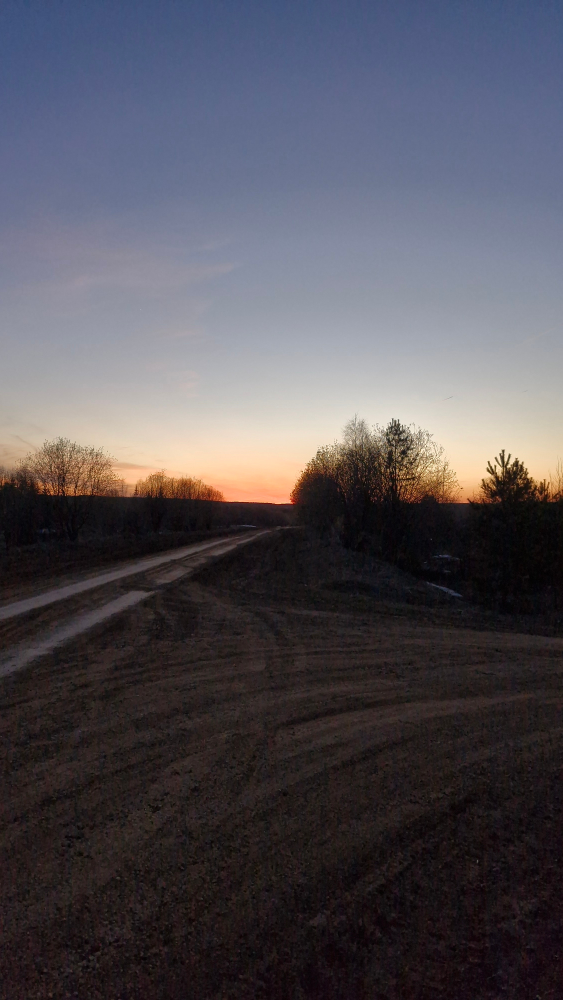 The image shows a dirt road running along the edge of a field or wooded area. The sky is visible, with a gradation from blue to orange, indicating sunset or sunrise. The location is Otchor, Russia. Thβ¦read more