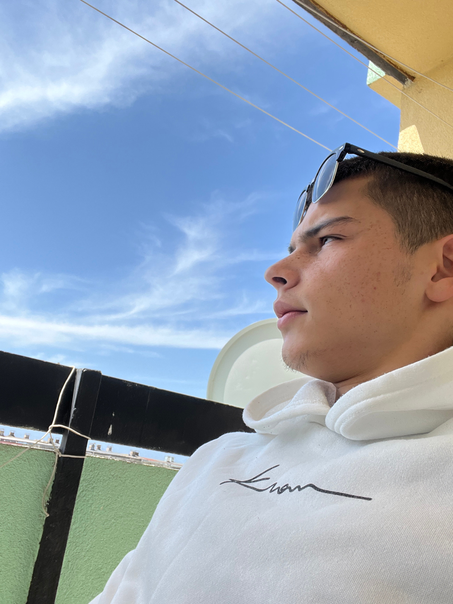 The image, rotated counter-clockwise, presents a low-angle view of a young man outdoors under a bright blue sky. The man, with short dark hair, light stubble, and visible freckles, wears sunglasses pu…read more