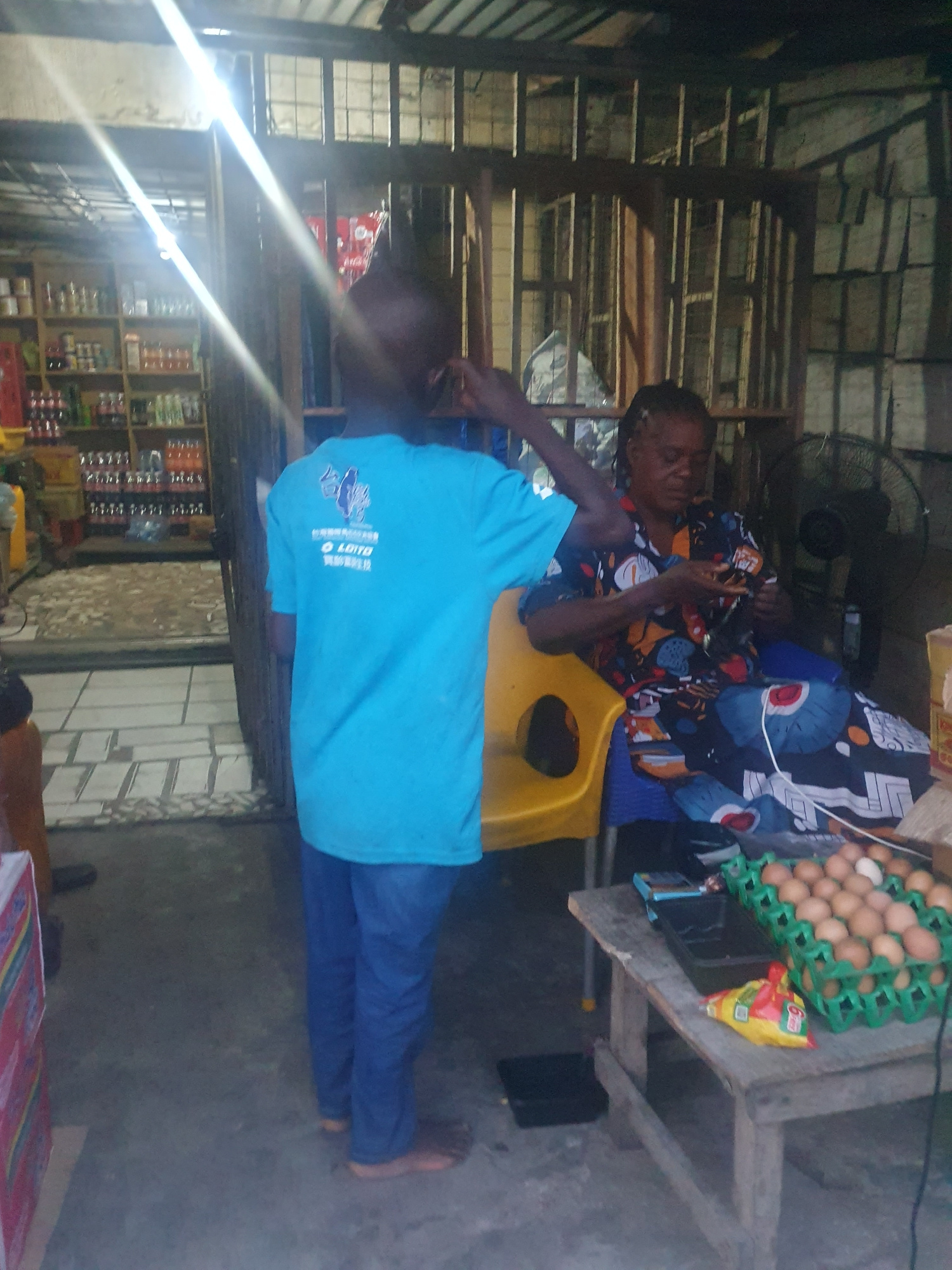 The image depicts two people in an indoor market setting in Lokoja, Nigeria. An adult female wearing a colorful dress and blue leggings sits on a yellow plastic chair, looking at a mobile phone held i…read more