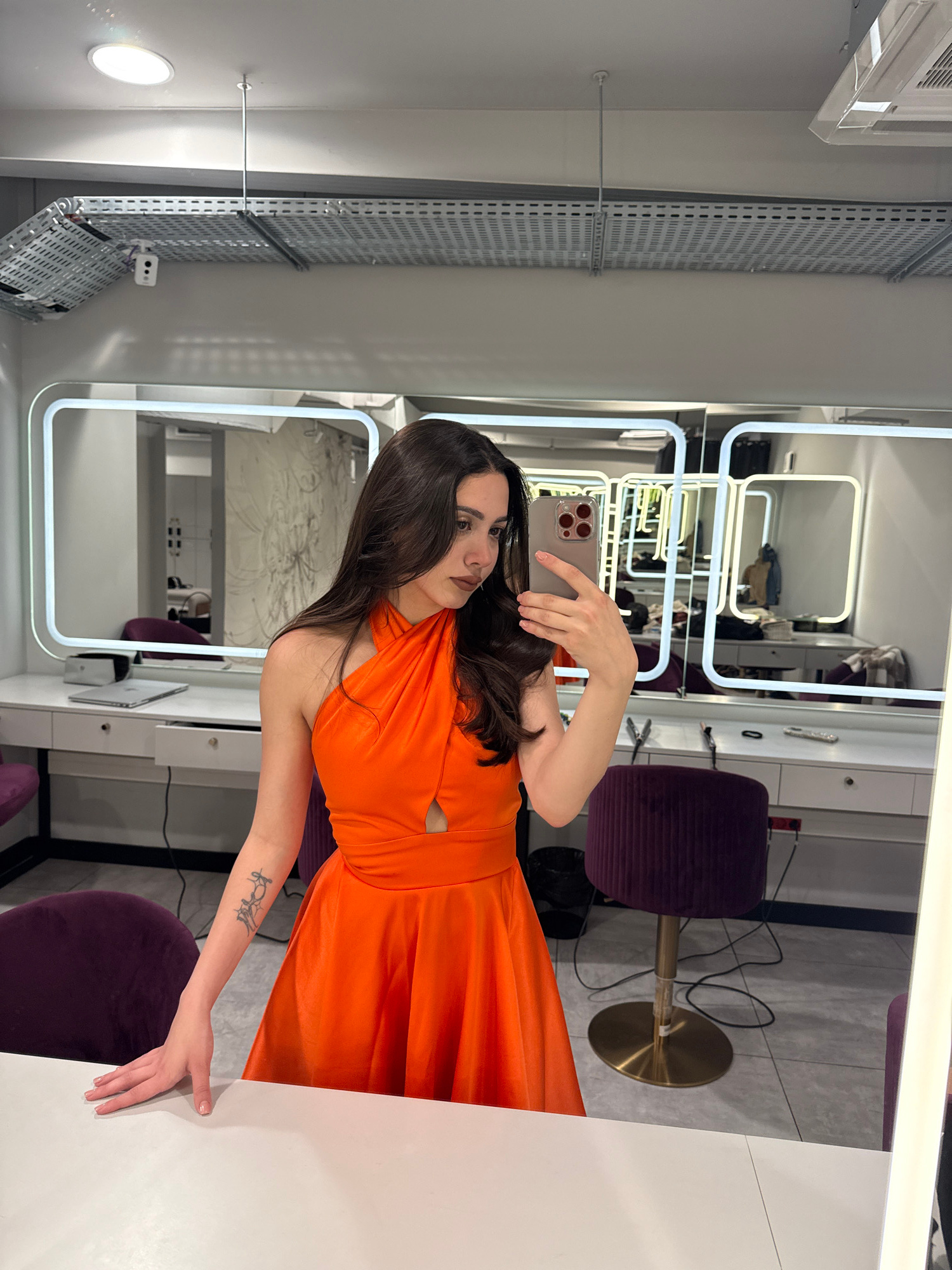 A young woman is captured taking a mirror selfie inside what appears to be a modern hair salon, beauty studio, or dressing room, located in Yerevan, Armenia. The original image is rotated 90 degrees c…read more