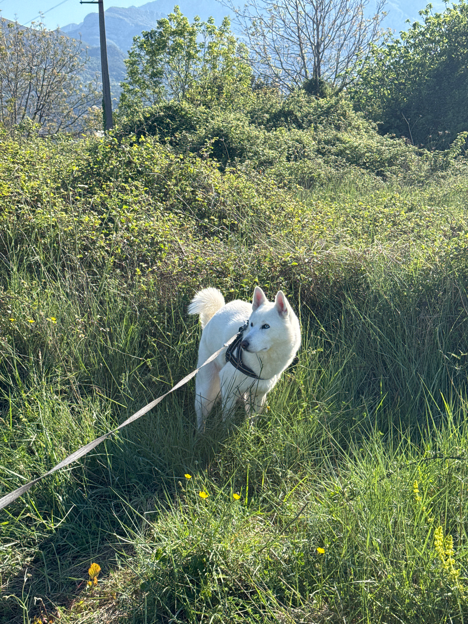 A white Akita dog, wearing a black harness, is lying in tall green grass in Polje, Montenegro. A leash is attached to the harness and extends out of frame. The scene is in daylight, with a hill covereβ¦read more