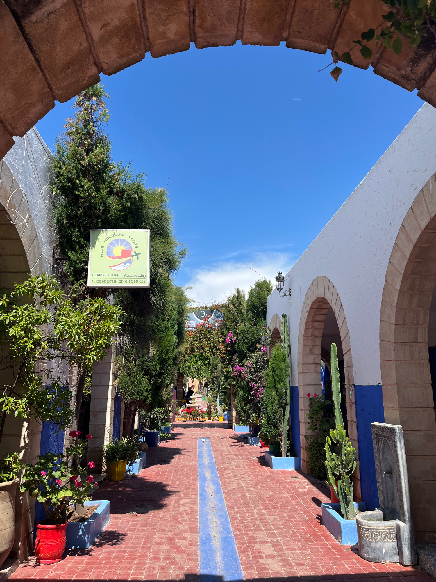 The image shows an outdoor courtyard in Essaouira, Morocco. The courtyard floor is brick, with a blue stripe running along its length. Planters line the edge of the courtyard. A sign for "MARS HOLIDβ¦read more