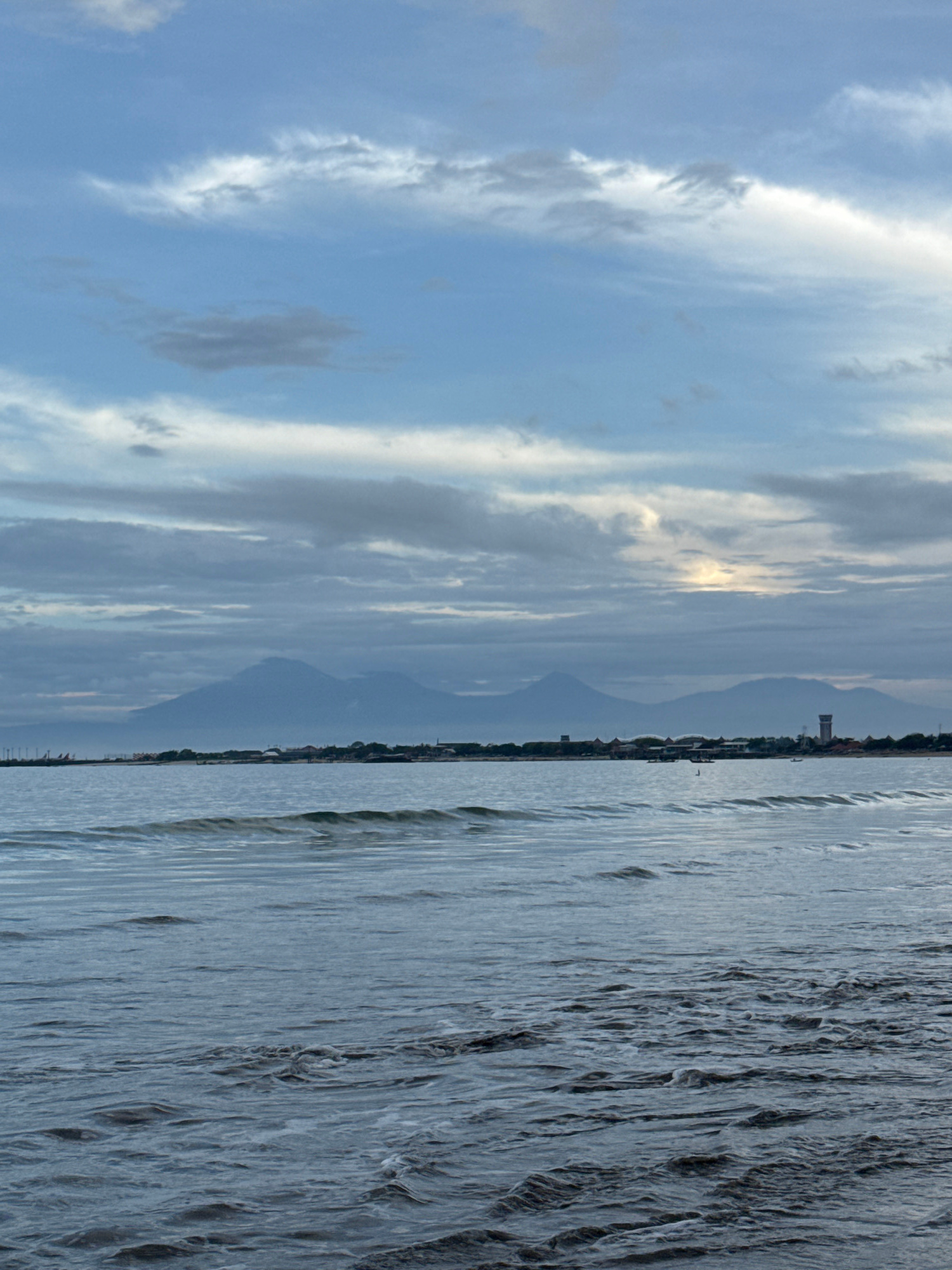 The image presents a landscape likely situated in Kuta Selatan, Indonesia, featuring a body of water in the foreground, potentially the sea or a large lake. The water surface displays subtle ripples a…read more