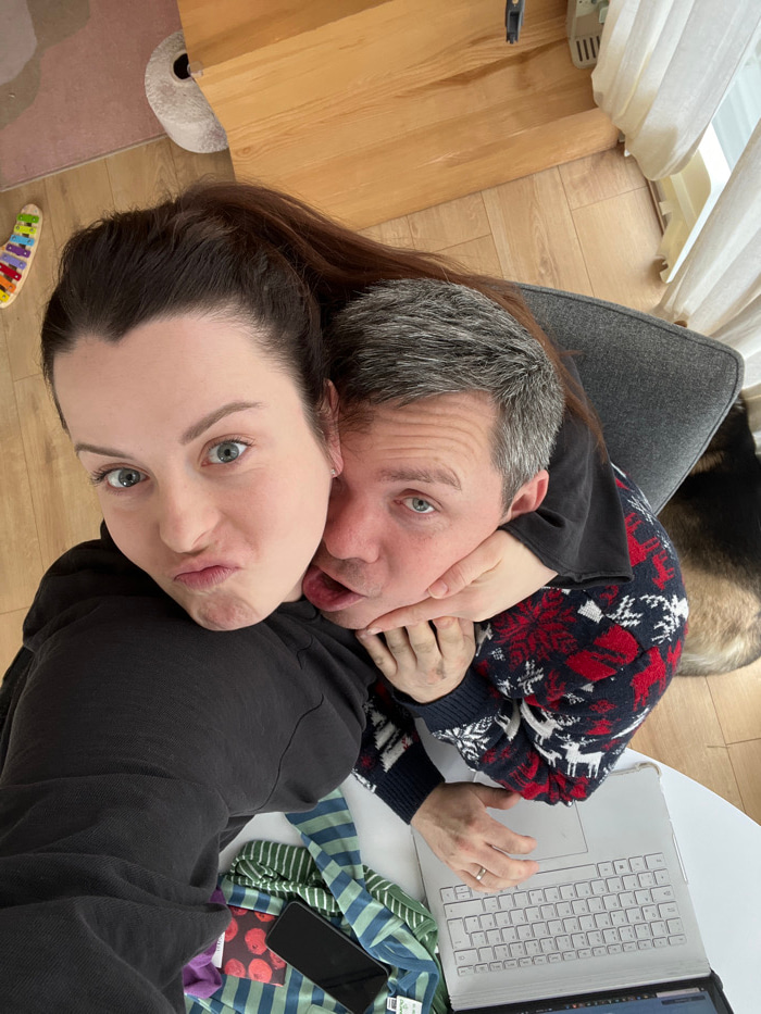 The scene depicts two individuals indoors in what is identified as a residential space in Gangloff, Germany. A female, with dark hair pulled back and wearing a dark long-sleeved top, occupies the fore…read more