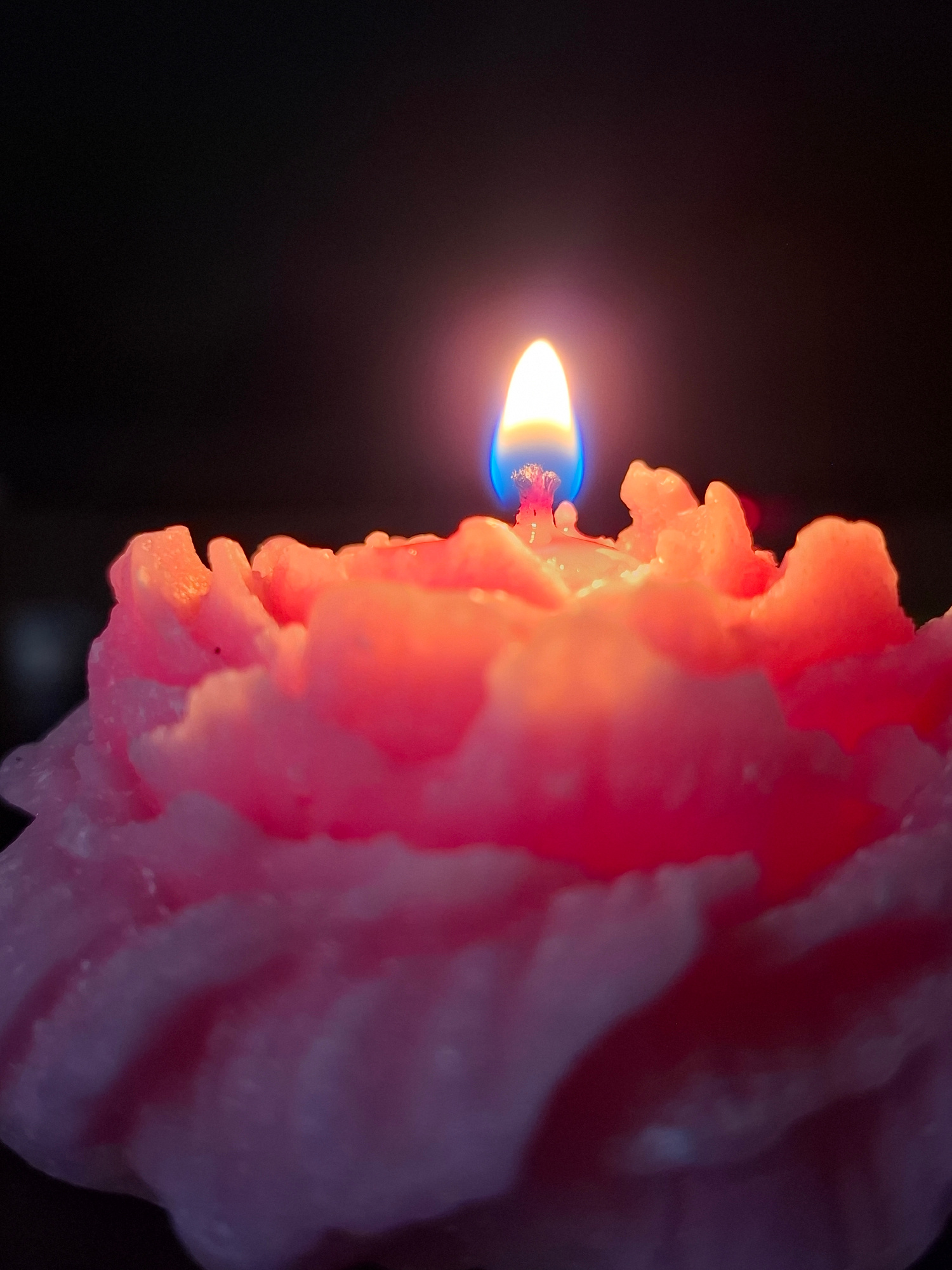 A close-up, vertical shot features a vibrant, burning pink or coral-colored candle against a stark, dark background. The candle, which occupies the left side of the frame, has a textured, possibly ruf…read more