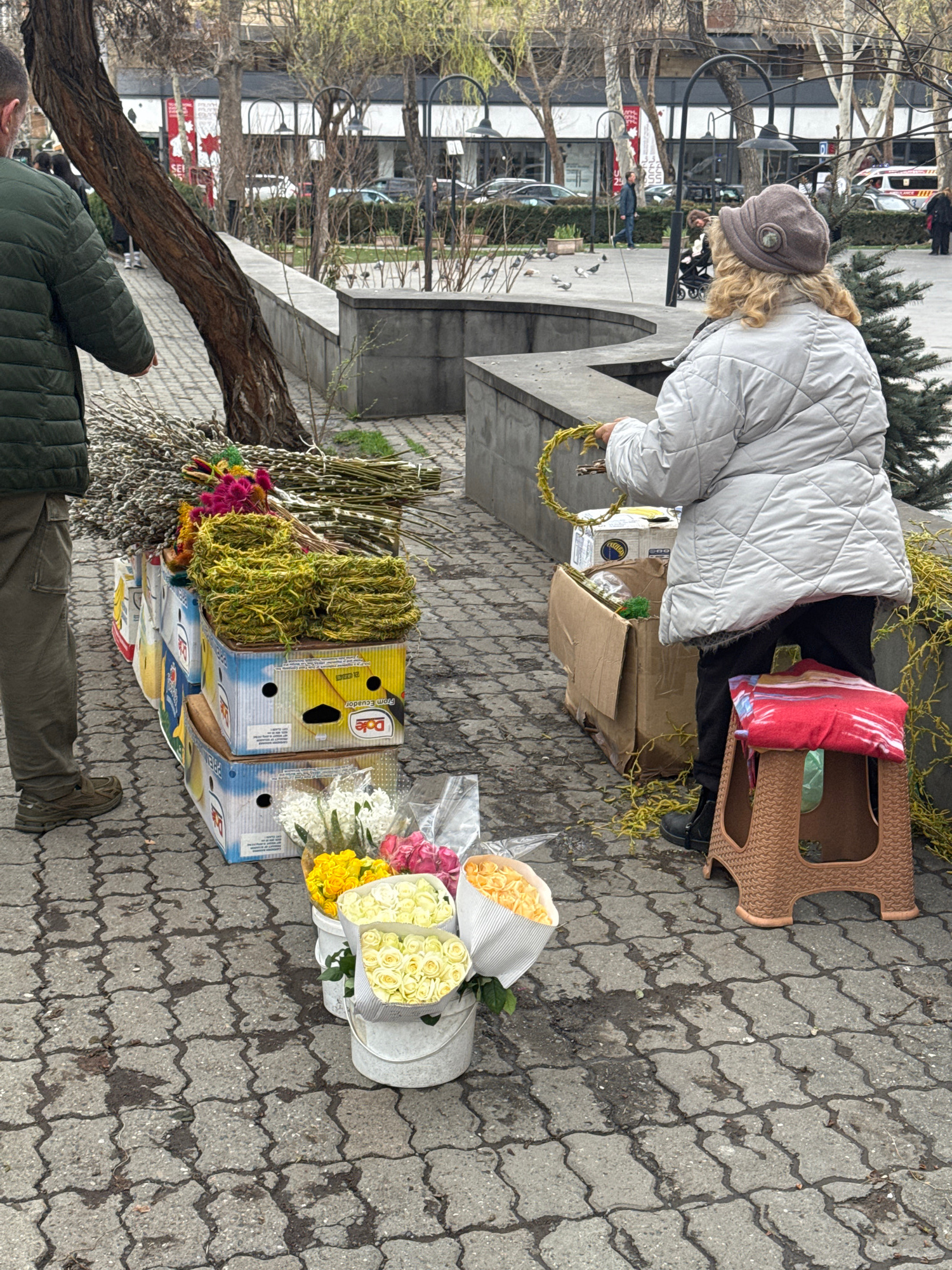The scene is a street in Yerevan, Armenia. An elderly woman wearing a gray hat and a white quilted jacket is working at a makeshift flower stand set up on the sidewalk. She is leaning over a cardboard…read more