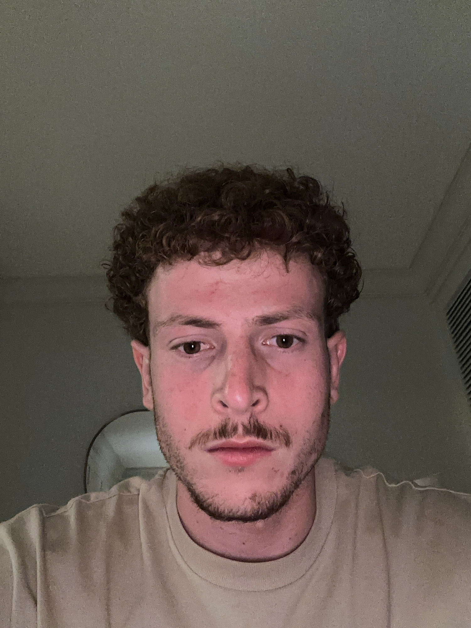 A medium, indoor shot shows a fair-skinned male facing slightly right. His head is tilted to his right, so his left eye is higher than his right. He has short, brown, curly hair and a short, brown bea…read more