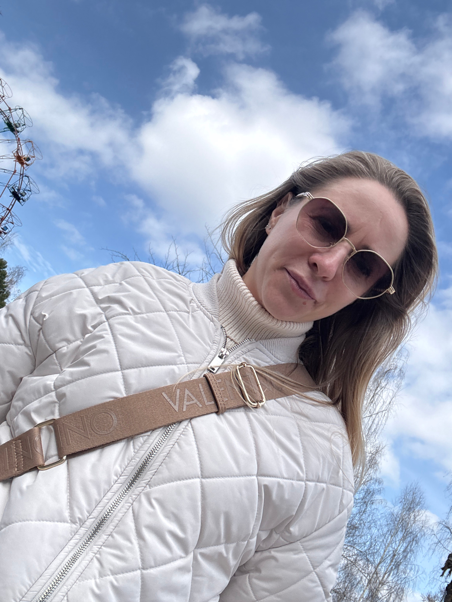 A woman is looking down at the camera, wearing sunglasses, a white quilted jacket, and a turtleneck sweater. She has a beige shoulder bag slung across her body. In the background is a blue sky with sc…read more