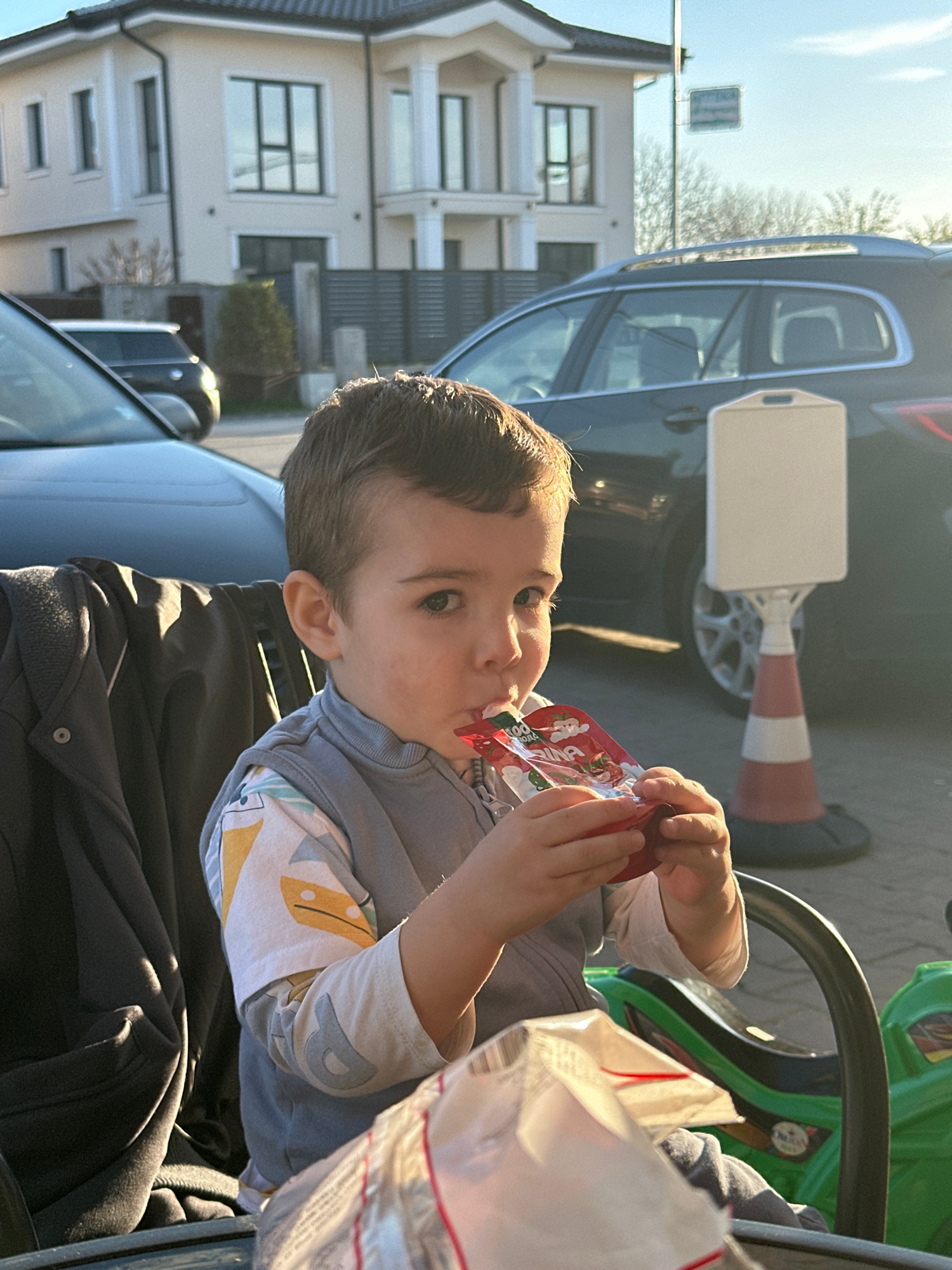A young child is drinking from a red fruit puree pouch while seated in a stroller, facing away from the camera. The child has short dark hair and is wearing a light-colored long-sleeved shirt under a…read more