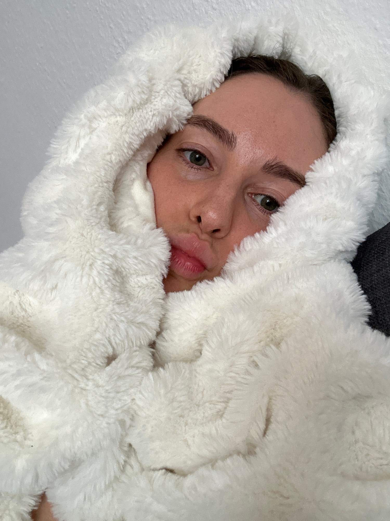 A close-up, slightly angled portrait captures a person wrapped in a soft, white, fluffy material. The person's face is visible, featuring green eyes, a small nose, and pouty lips. Only the head and pa…read more