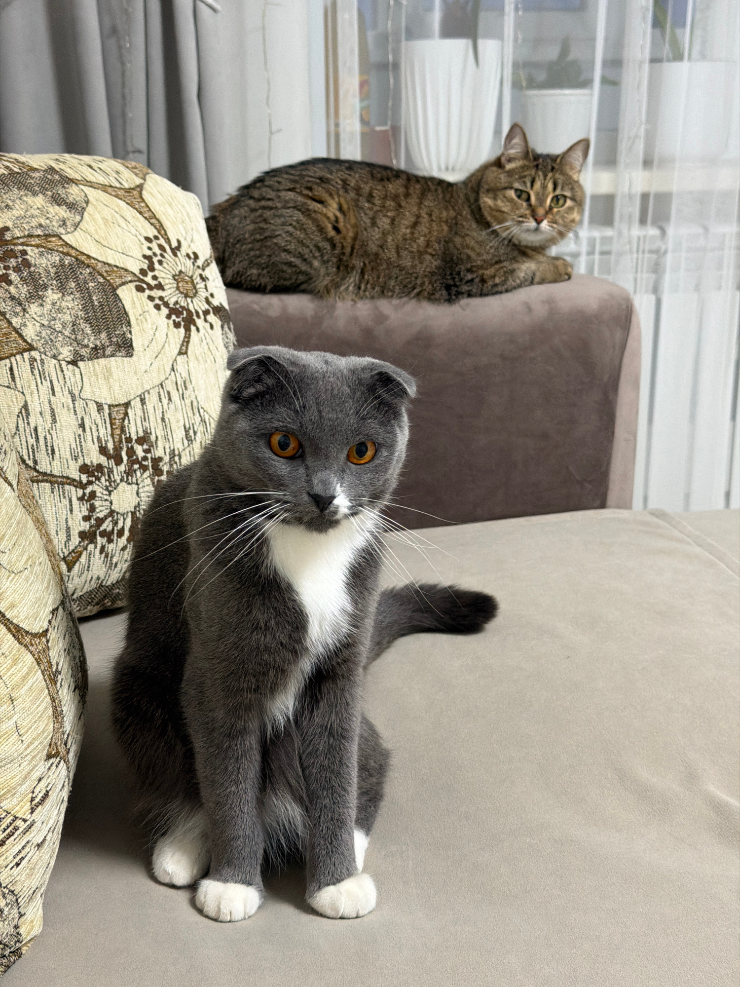 The image shows two cats in an indoor setting, likely a home. A tabby cat is standing on a patterned pillow or cushion, leaning against a brown upholstered object (possibly a chair or sofa armrest) ne…read more