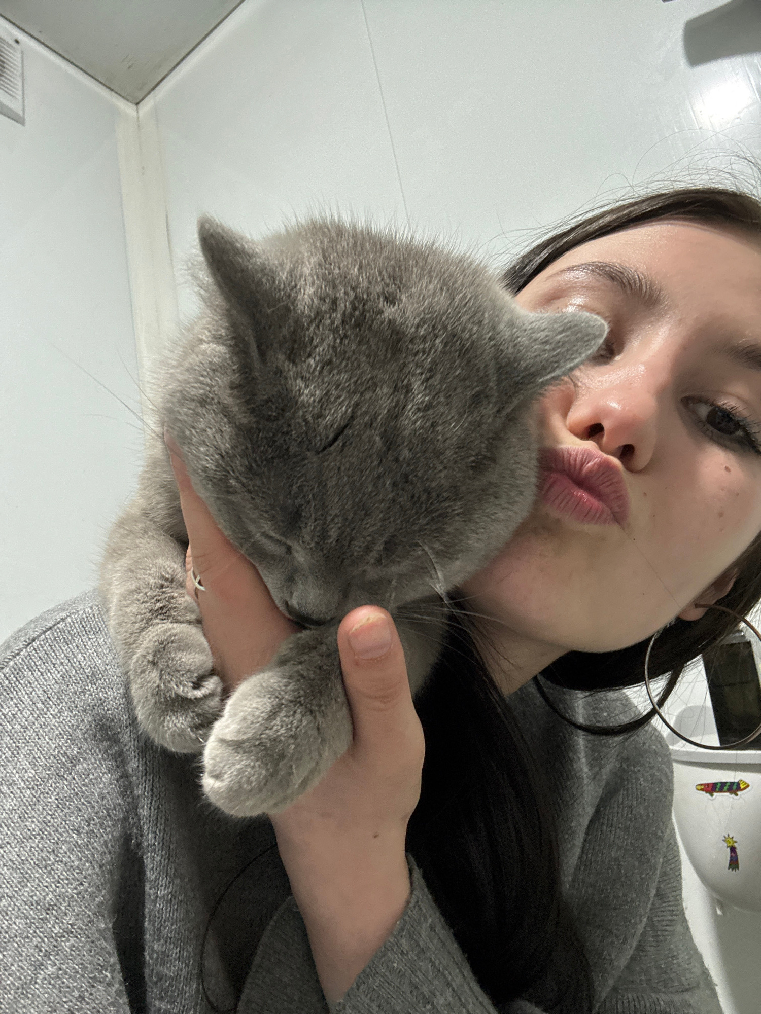 A close-up selfie captures an intimate and tender moment between a person and a gray domestic cat, set indoors in Фоки, Russia. The image is taken from a high angle, looking down slightly on the subje…read more