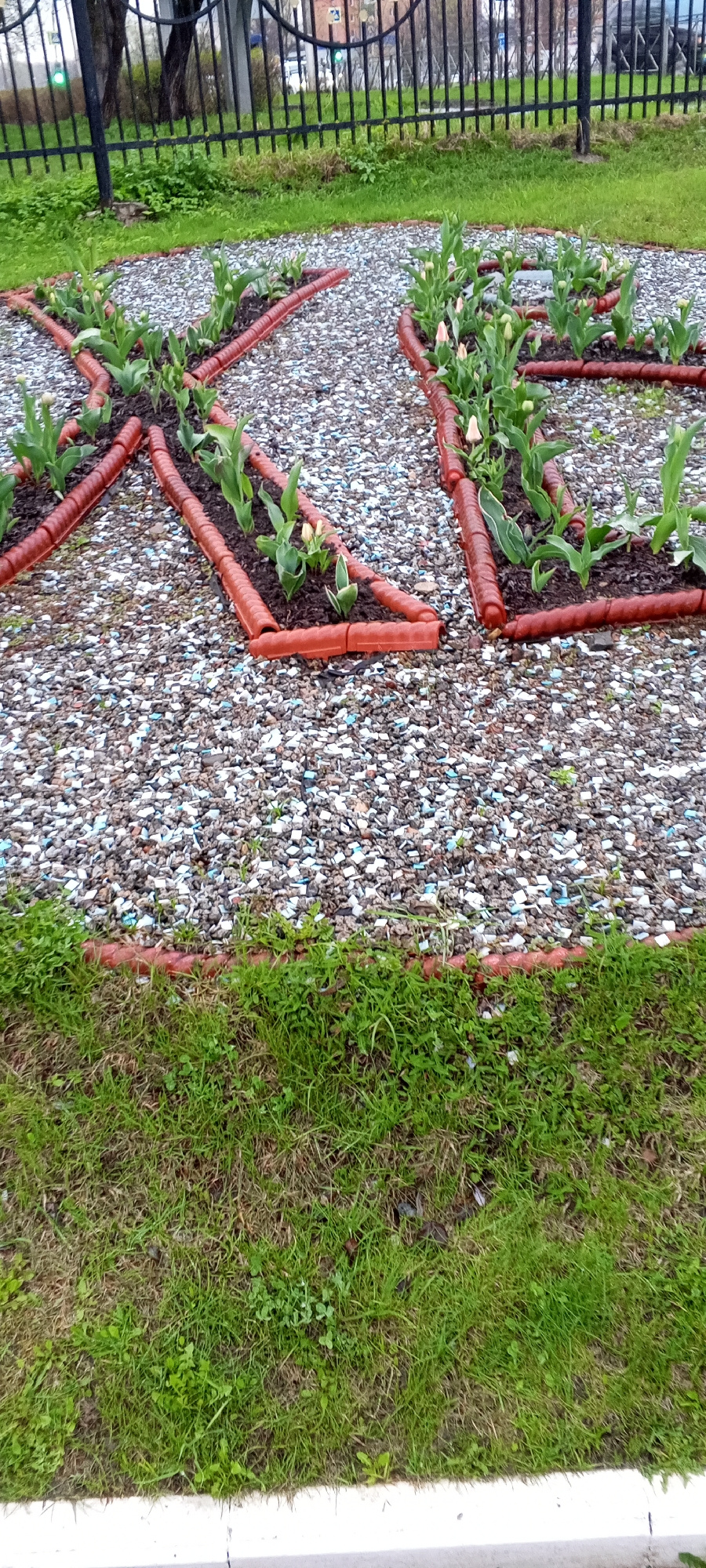 The image shows a flowerbed in the shape of the Cyrillic letters "XB," a traditional Russian Easter greeting, located in Dmitrov, Russia. The letters are defined by brown plastic borders filled with s…read more